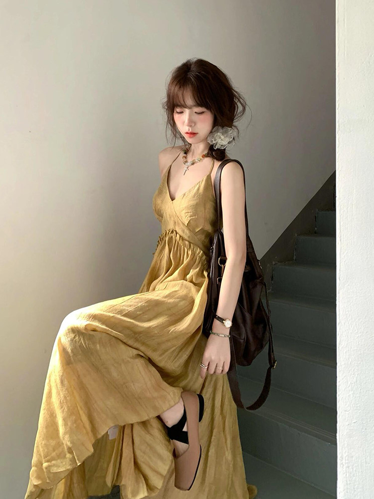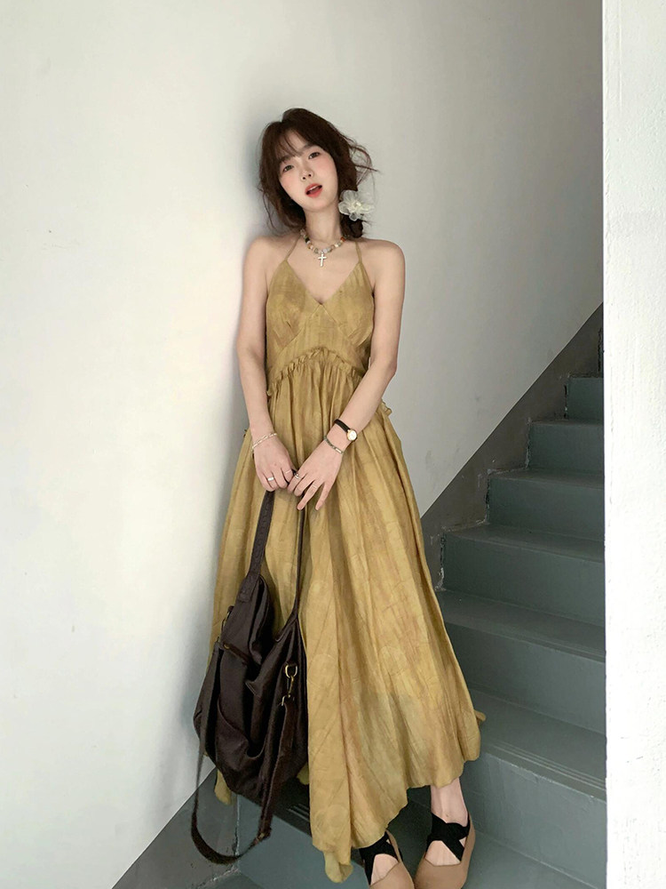 微胖mm新中式国风V领吊带连衣裙女设计感小个子褶皱气质度假长裙
