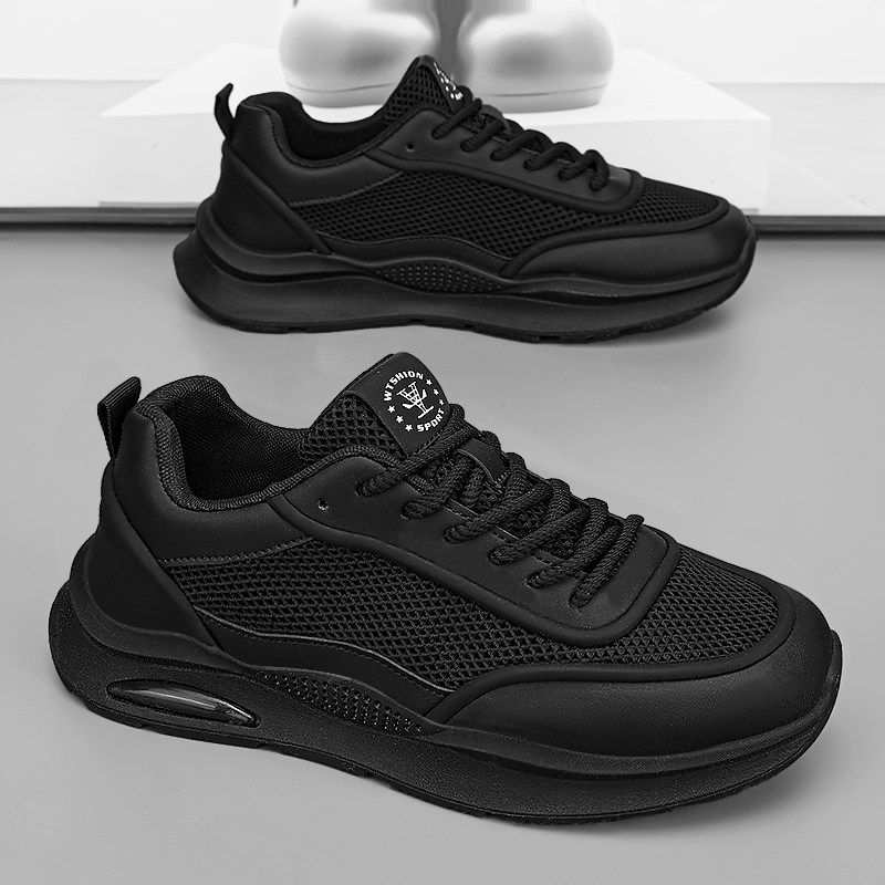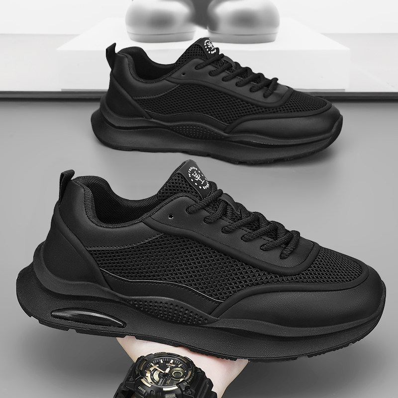 男鞋春季透气休闲运动网面厨房防滑工作上班纯黑色厨师劳保老爹鞋