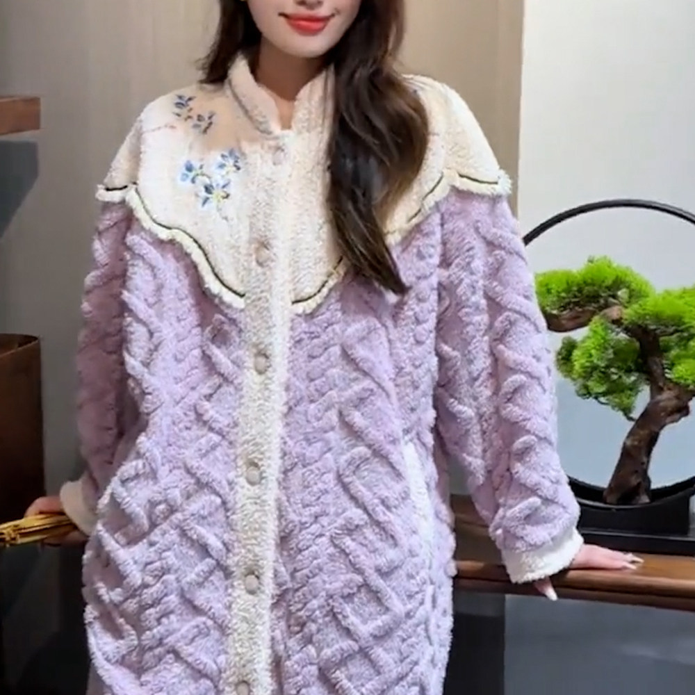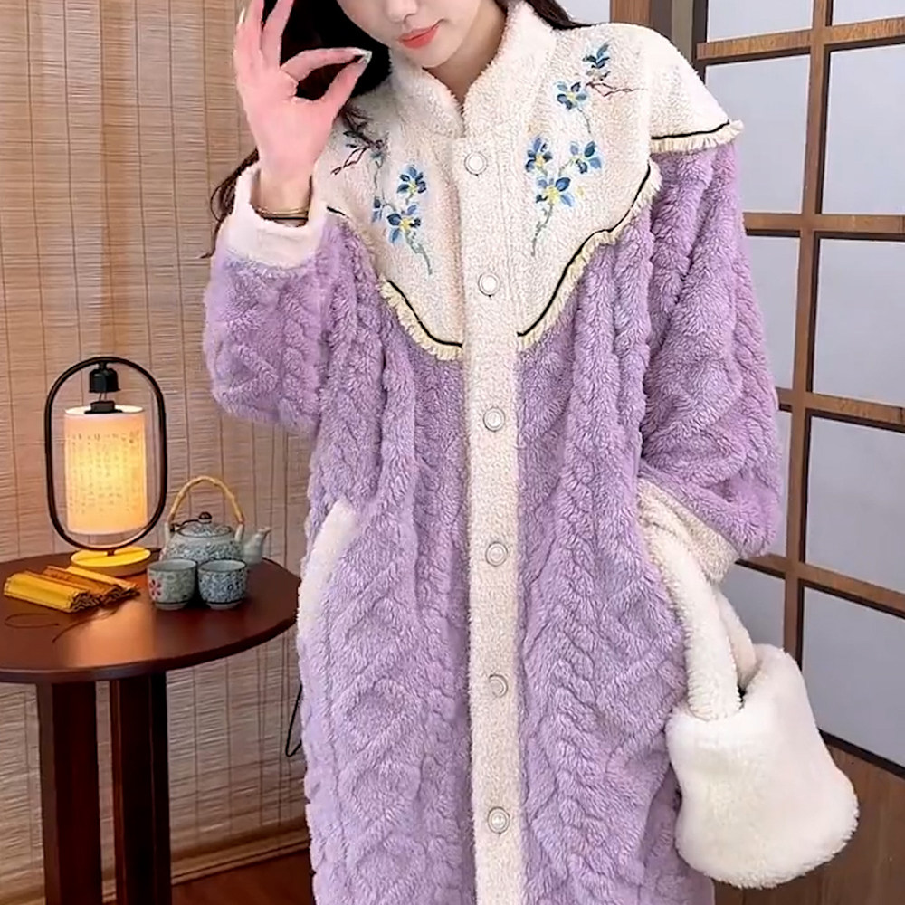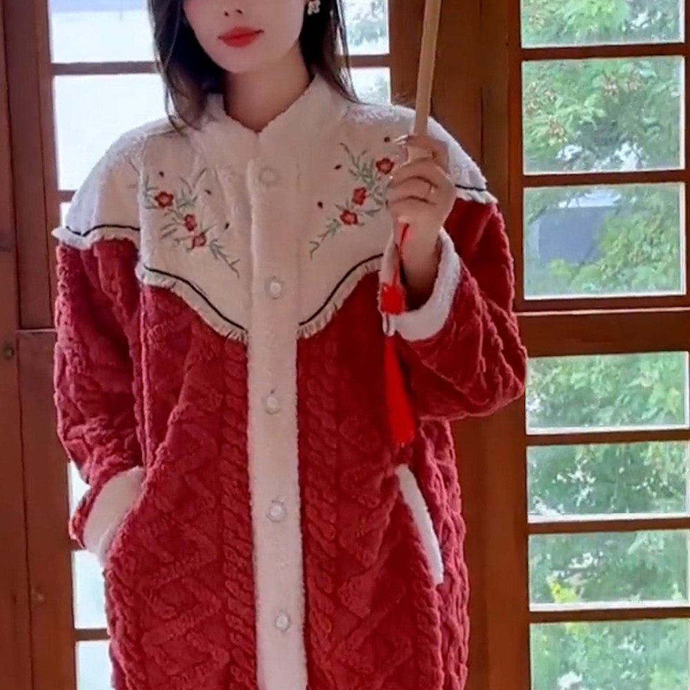 新中式国风加厚珊瑚绒睡袍套装2024秋冬季女款长款加绒保暖家居服