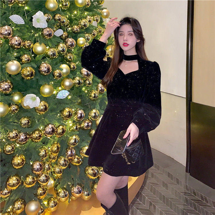 赫本小香风圣诞节红色金丝绒连衣裙女秋冬季气质内搭打底礼服裙子