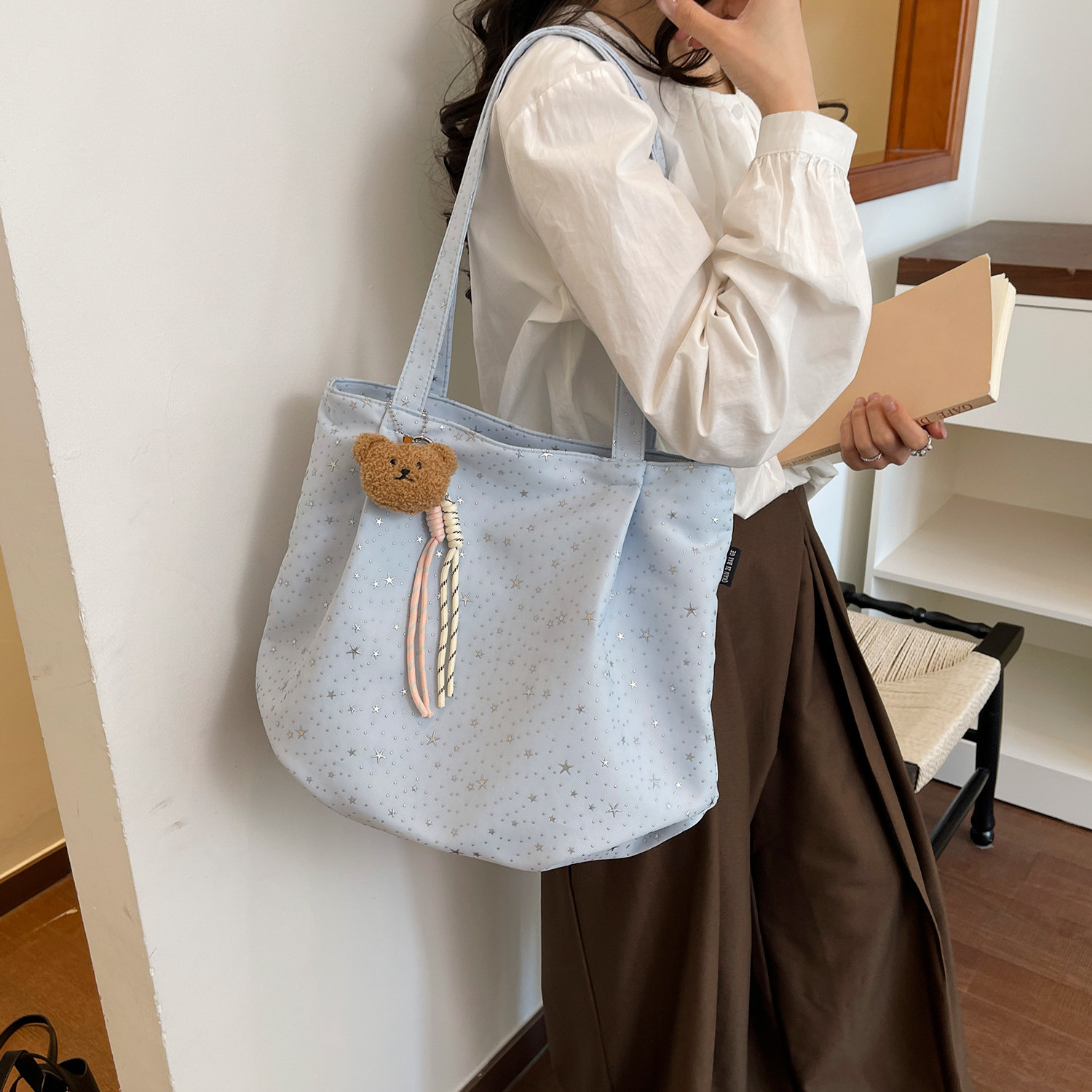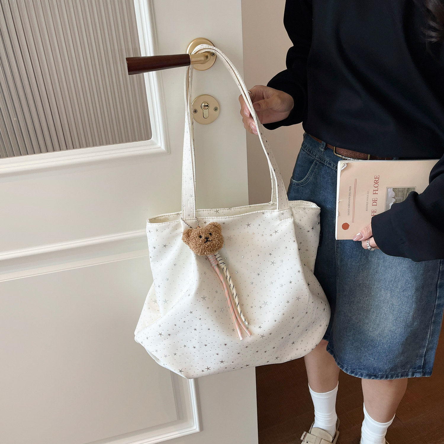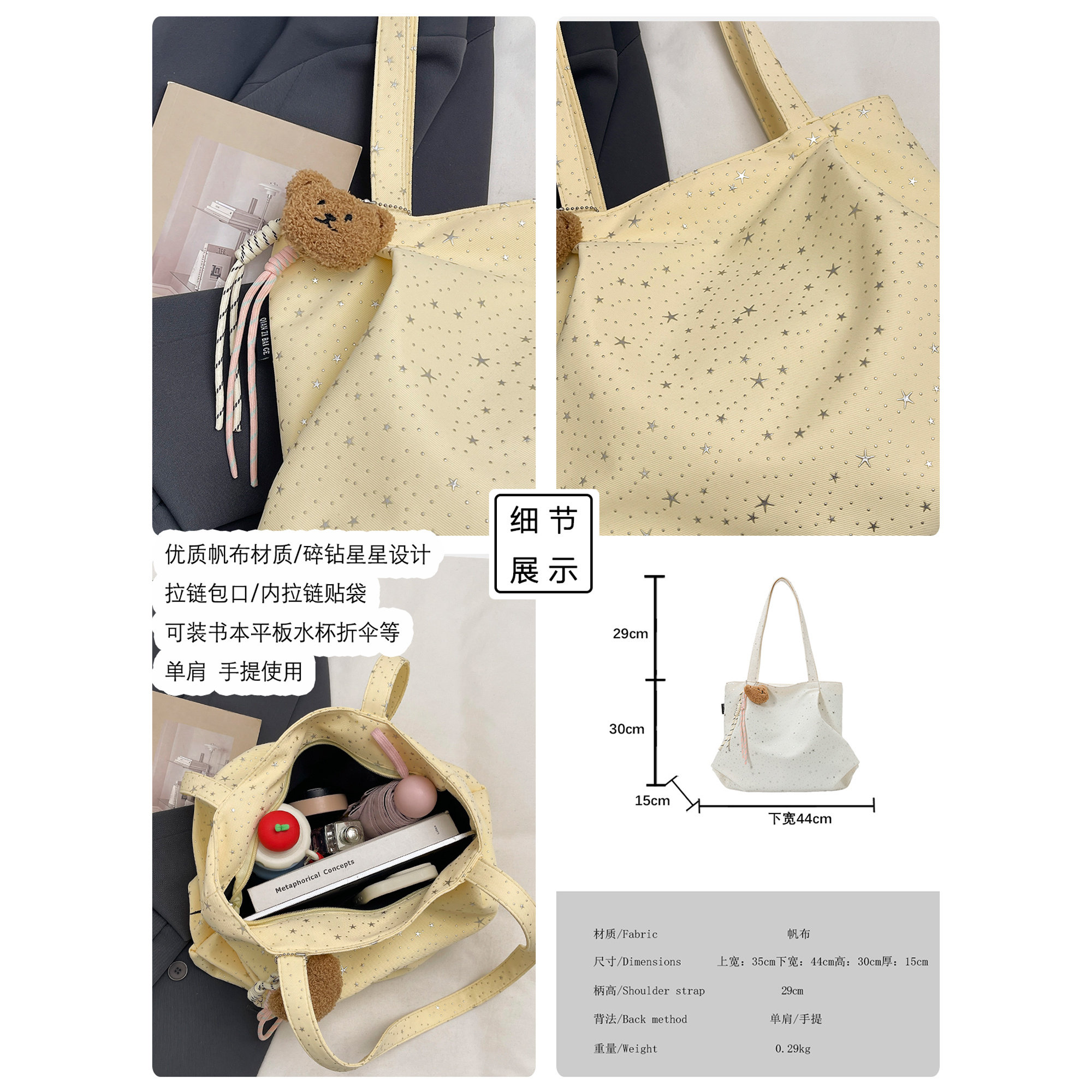 2026新款小众设计星星碎钻帆布包包女韩版大容量带拉链通勤托特包