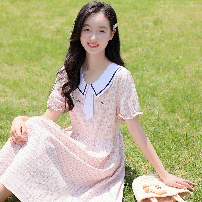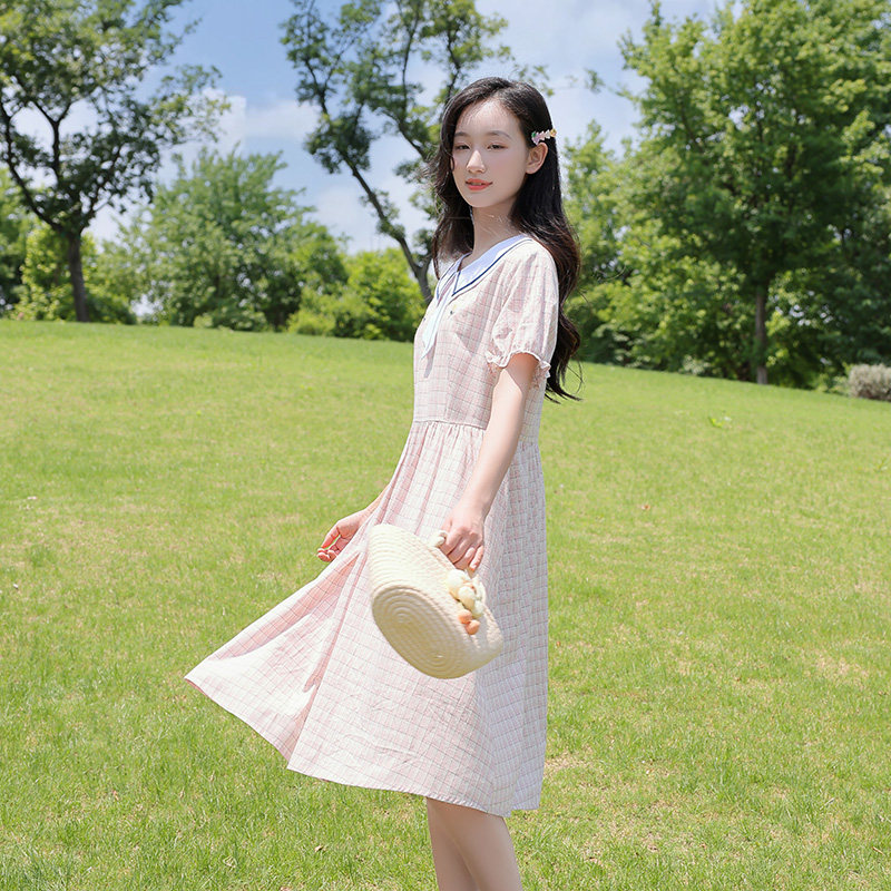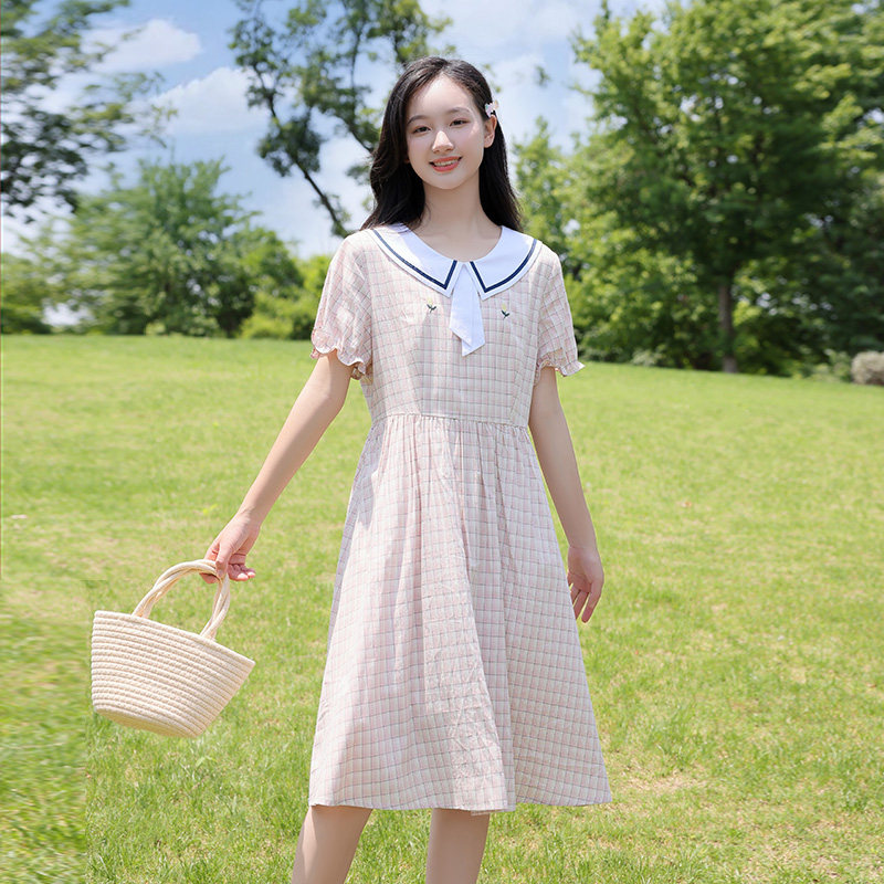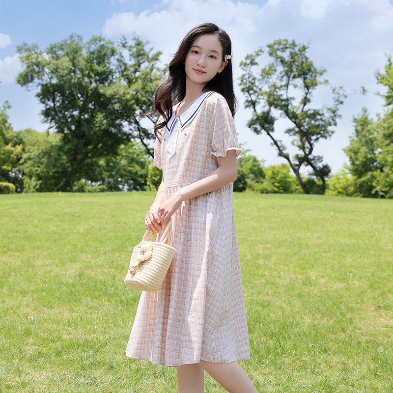 少女格子连衣裙子夏季学院风高初中生森系中长款大摆裙过膝裙纯棉