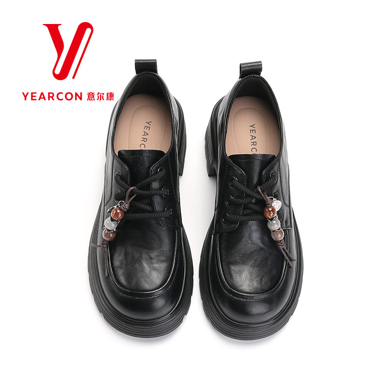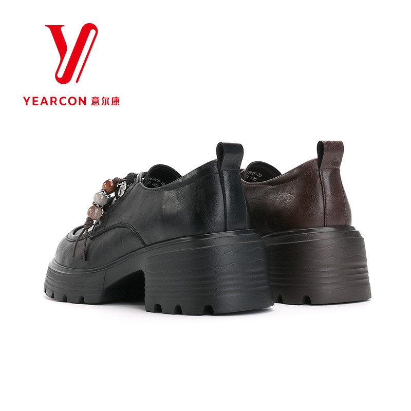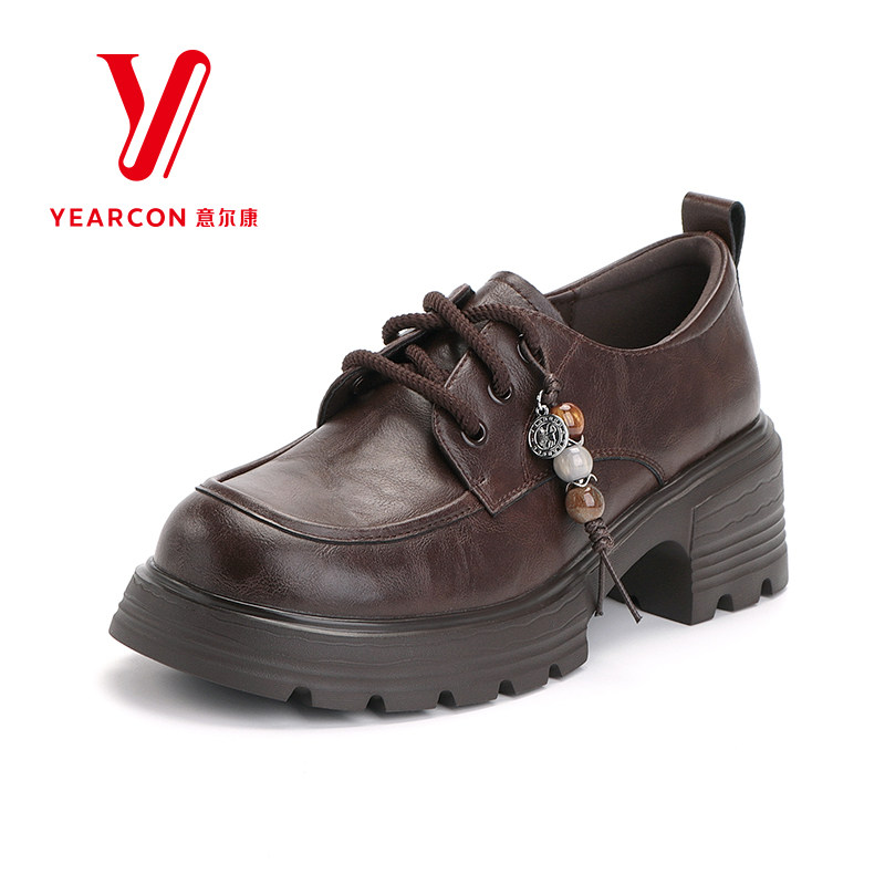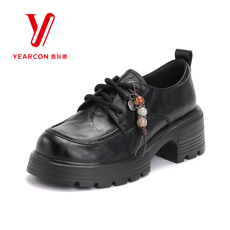 意尔康女鞋2026新款春季小皮鞋女真皮粗跟高跟单鞋系带乐福鞋厚底