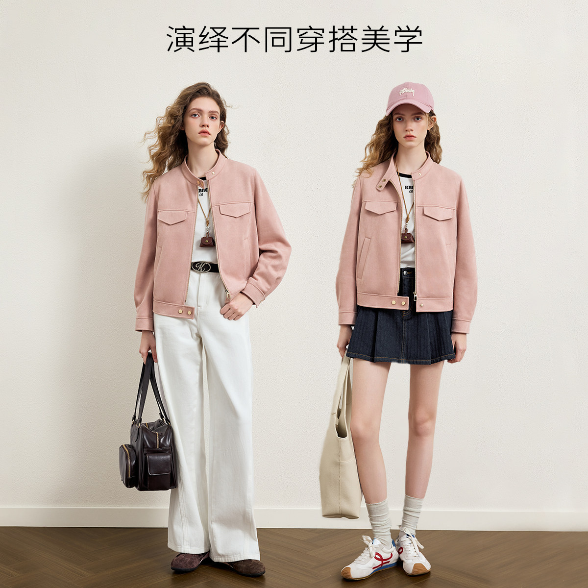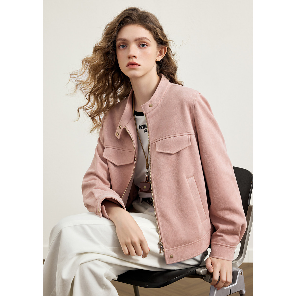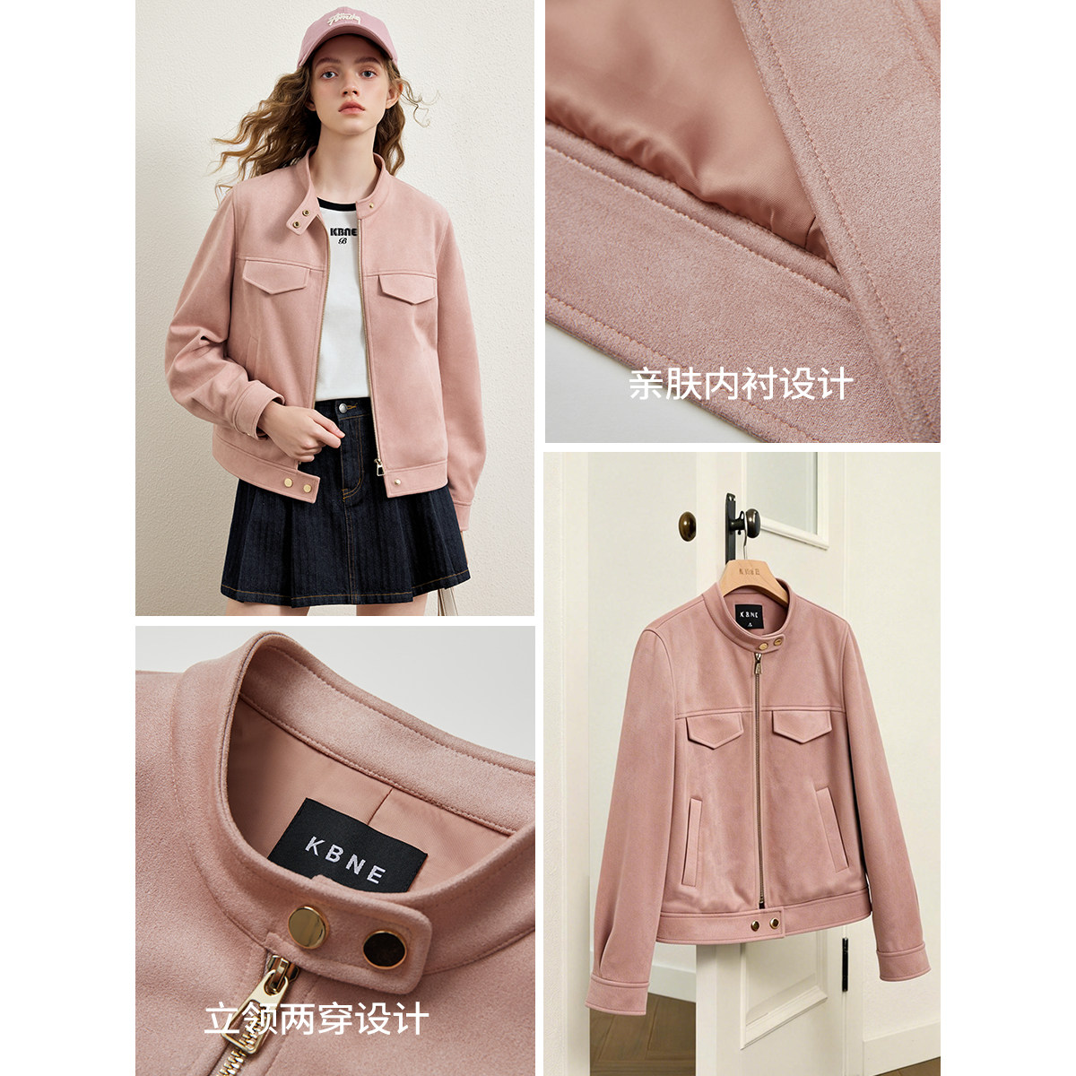 KBNE小个子短款仿麂皮粉色外套女装2026春季新款宽松廓形立领上衣