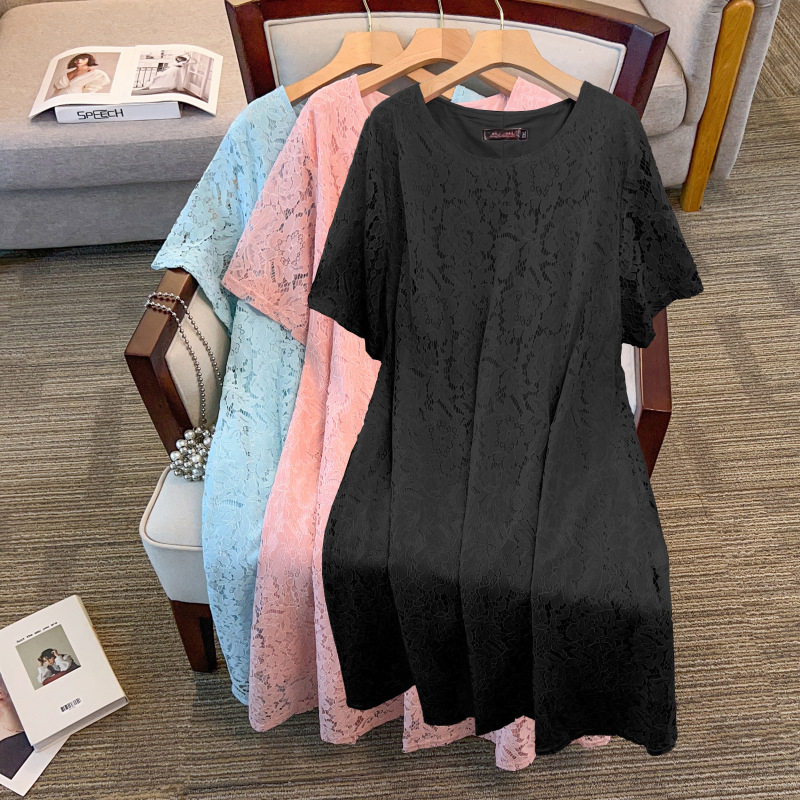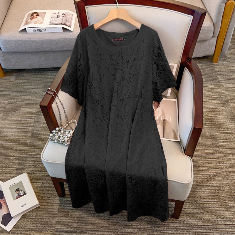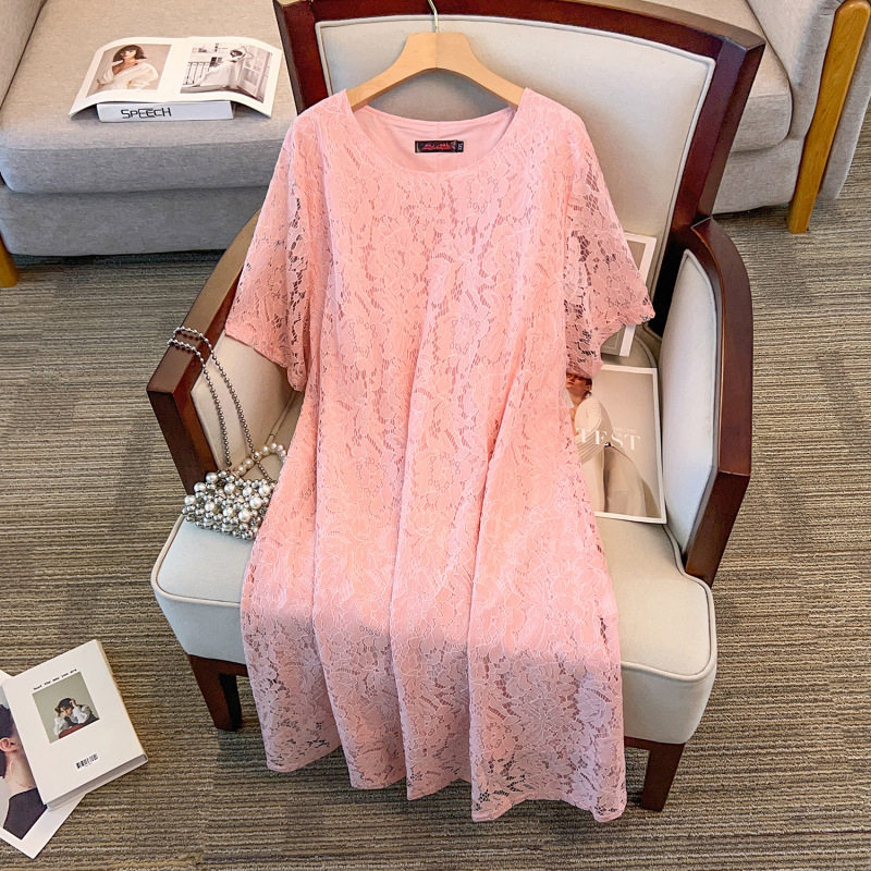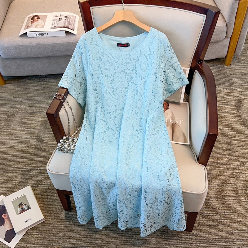 2025夏季韩版300斤特大码胖mm洋气显瘦遮肚子蕾丝短袖A字连衣裙女