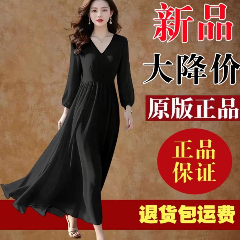 高档红色真丝雪纺连衣裙2025春秋长袖气质显瘦度假沙滩长款长裙女
