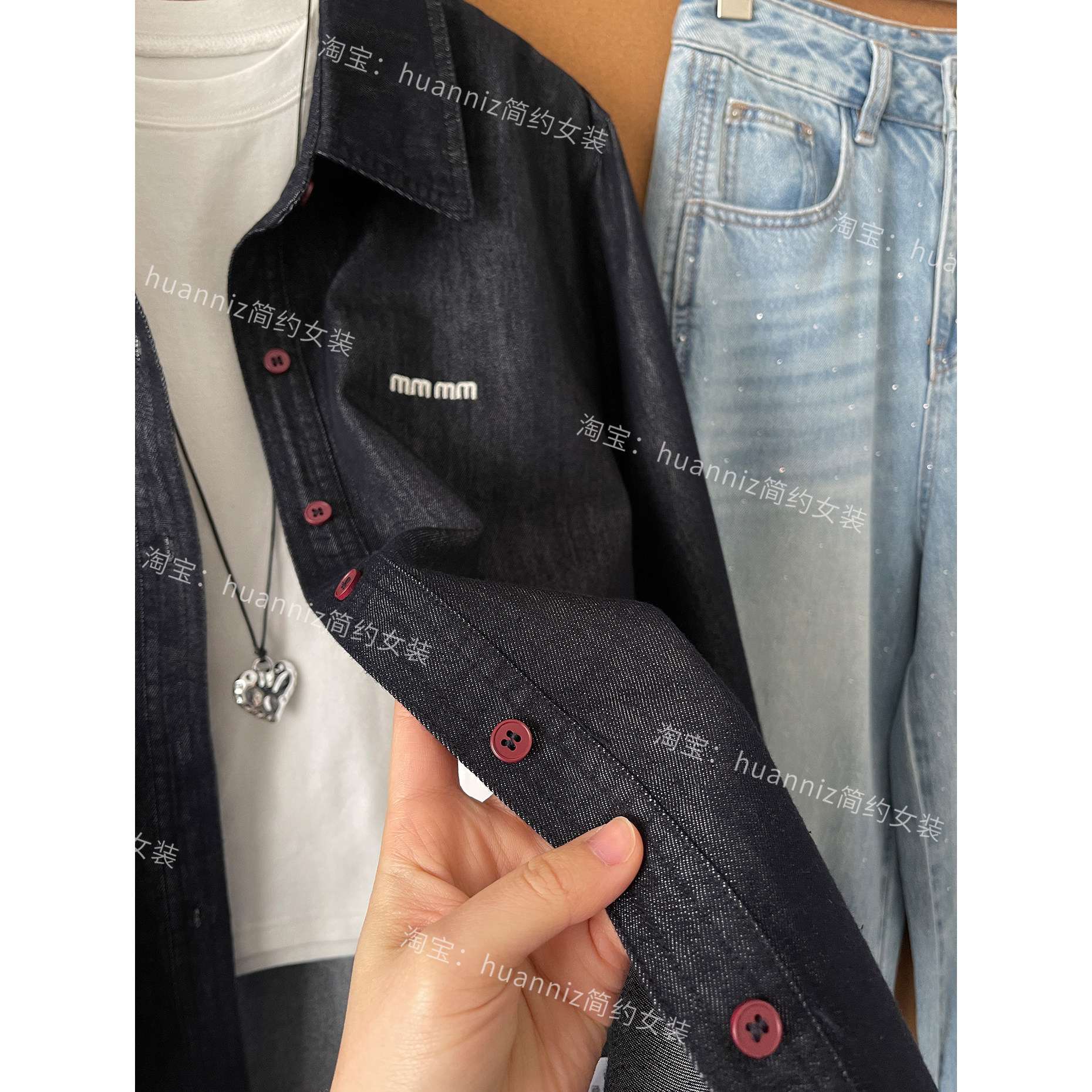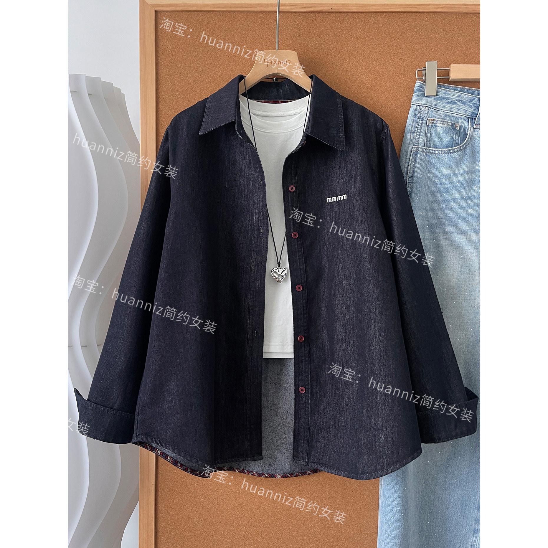 春季复古刺绣红扣子宽松牛仔衬衫女翻领长袖防褪色普洗蓝外套衬衣