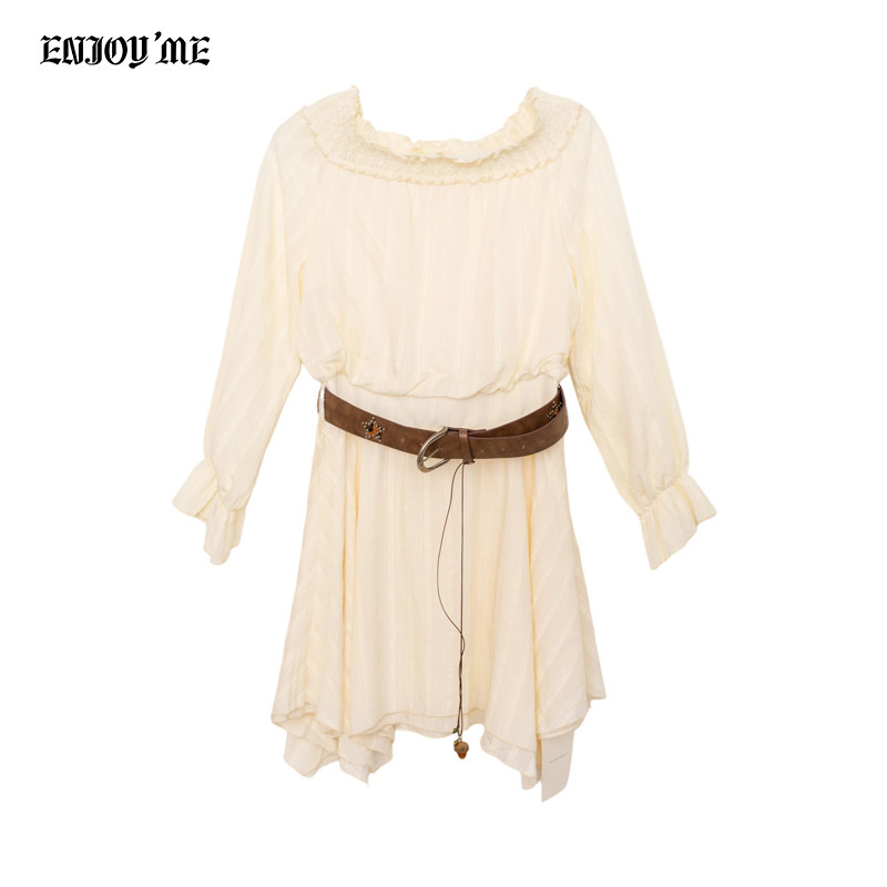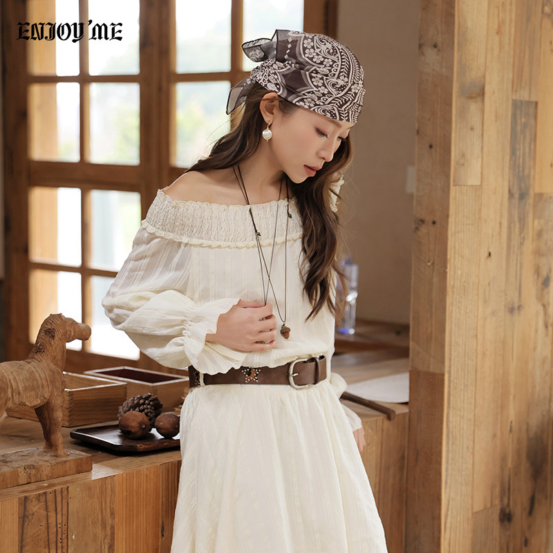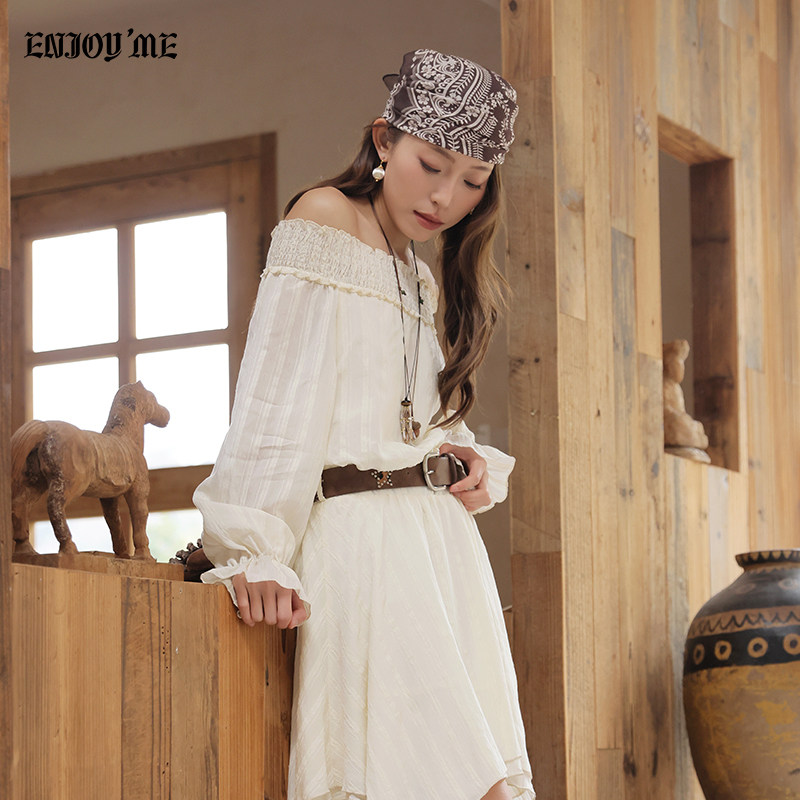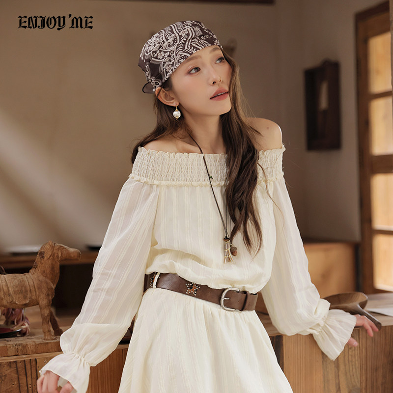 ENJOYME商场同款法式一字肩长袖连衣裙女夏季白色露肩显瘦中长裙