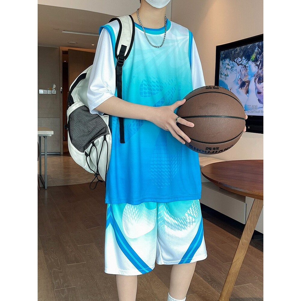 短袖篮球服套装男球衣定制速干冰丝T恤青少年运动宽松短裤假两件