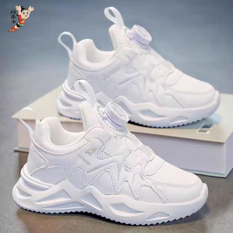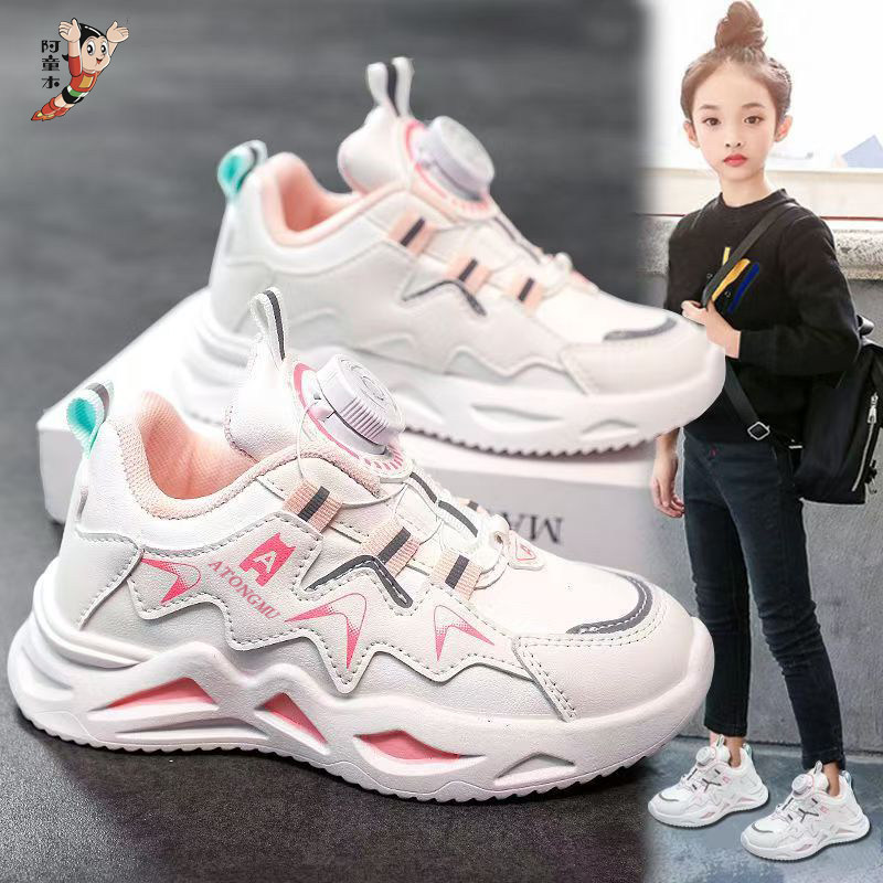 阿童木女童2026春季新款皮面防水运动鞋旋转纽扣防滑休闲跑步鞋子