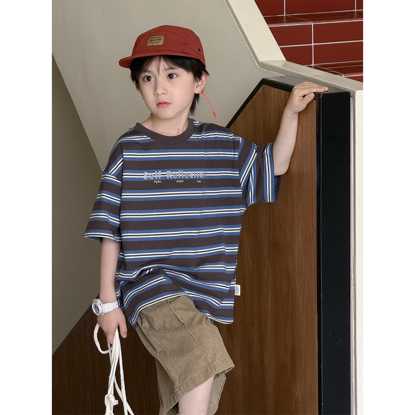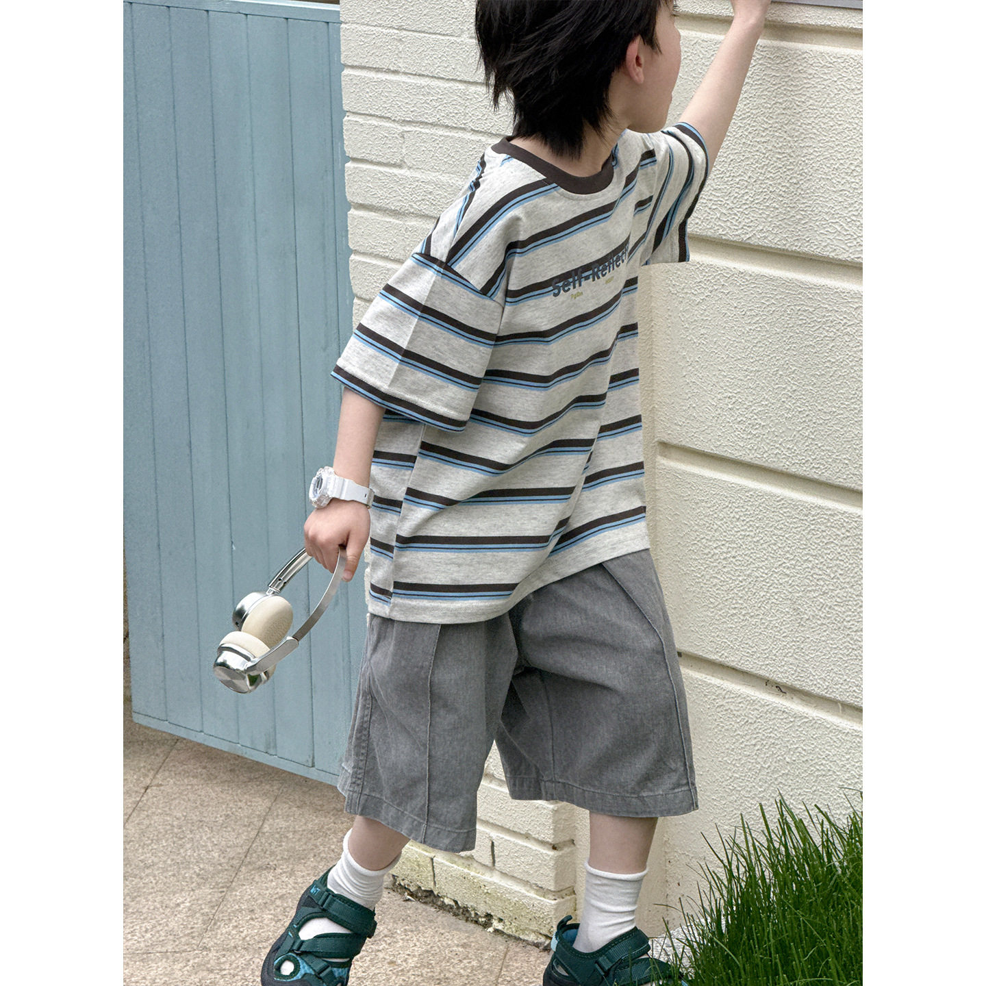 2026新品夏装韩版儿童复古撞色条纹短袖休闲宽松男女童透气T恤潮