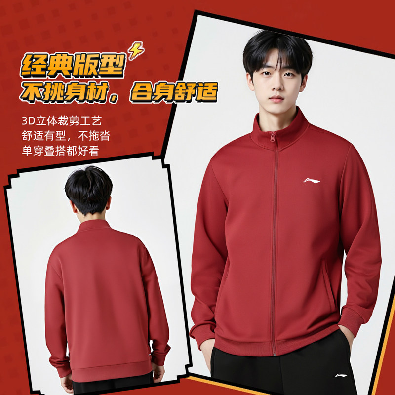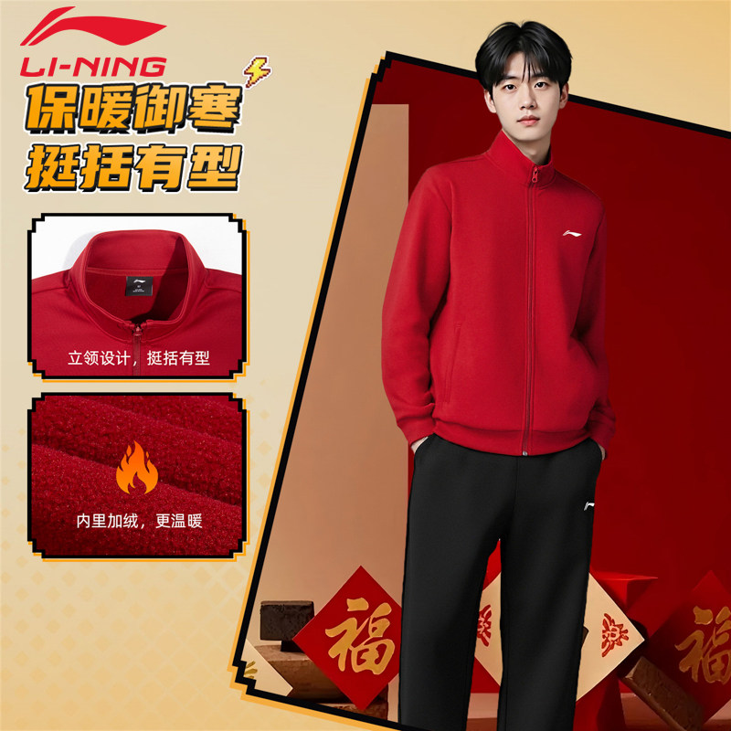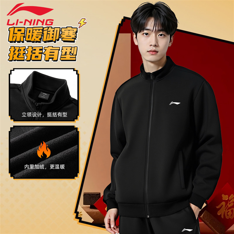 李宁男子新年开衫外套26春节男士青少年加绒保暖潮流百搭休闲外套