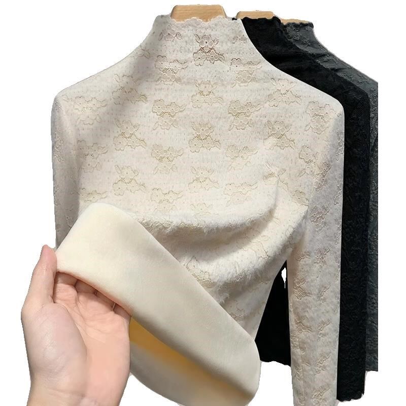 半高领蕾丝打底衫女秋冬高级感内搭可外穿加绒加厚一体绒保暖上衣