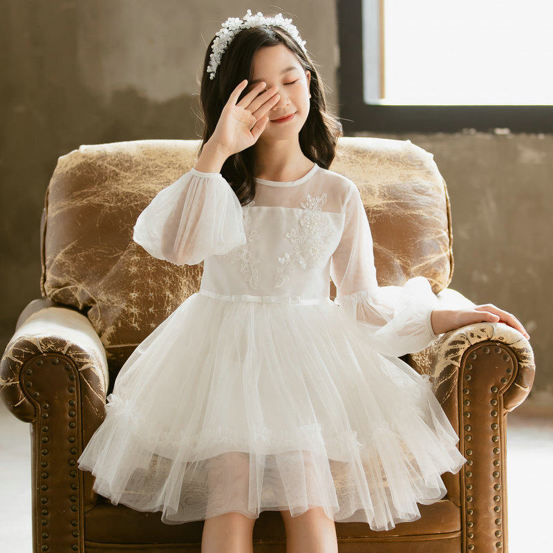 春秋冬加绒儿童公主裙女童白色连衣裙蓬蓬婚纱裙子小女孩演出礼服