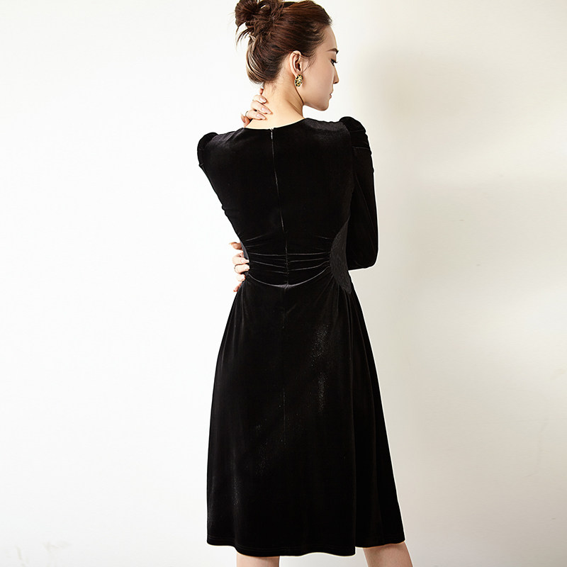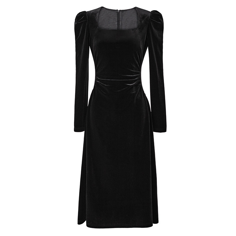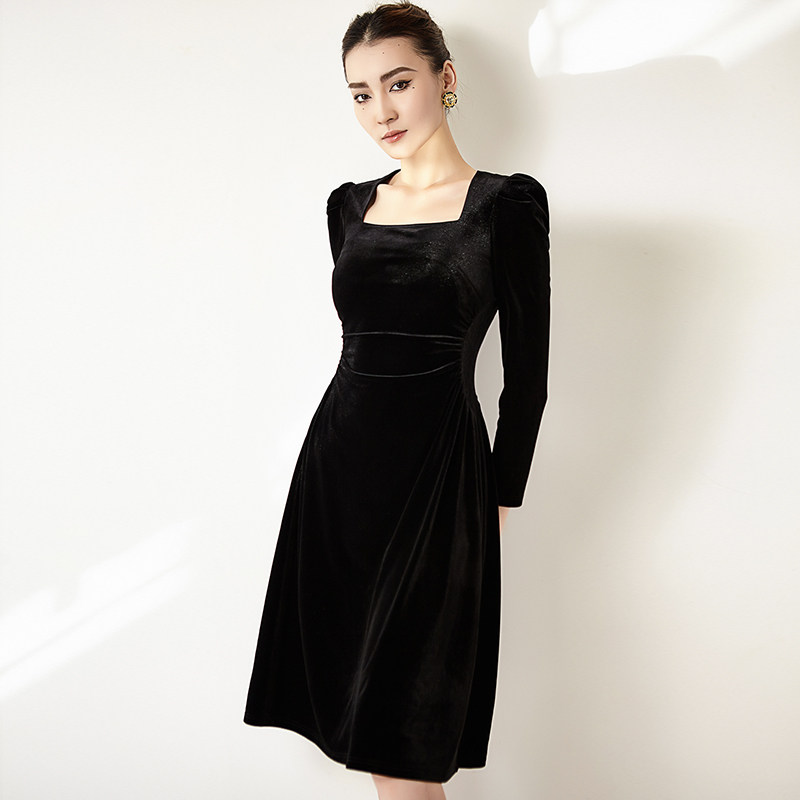 春季内搭黑色泡泡袖法式方领丝绒连衣裙女装气质收腰显瘦a字长裙
