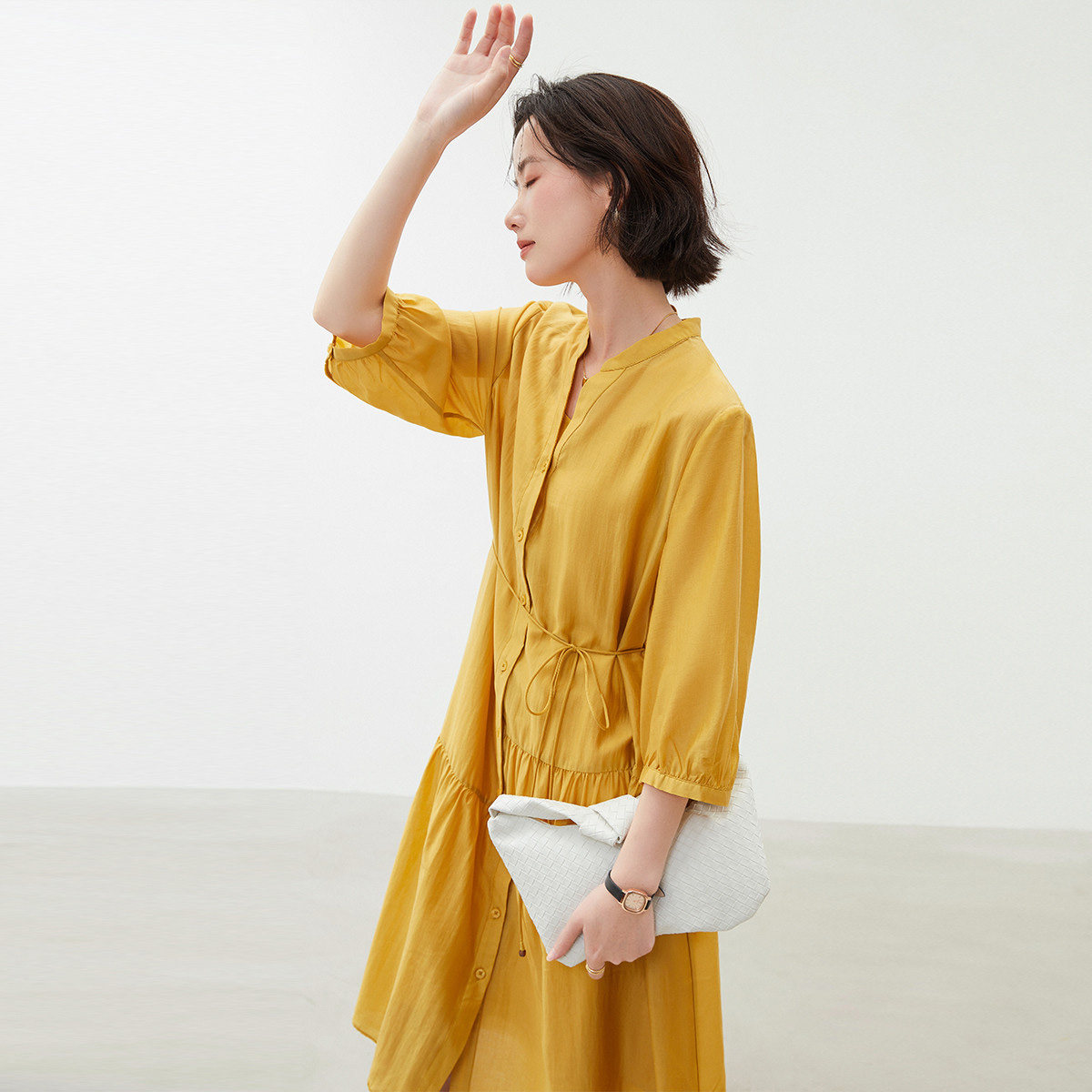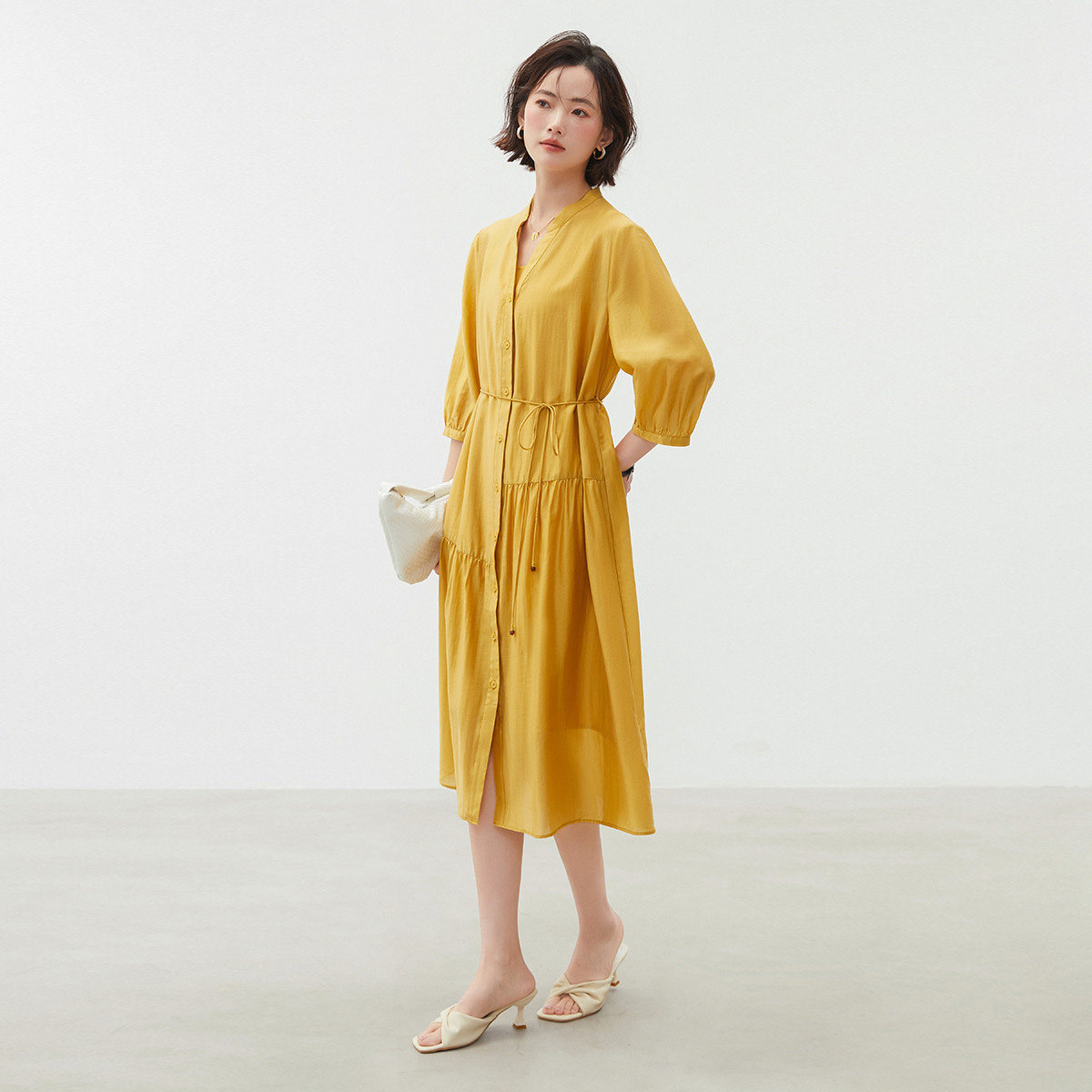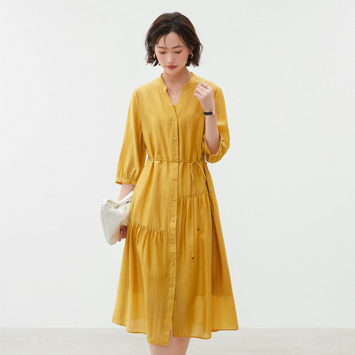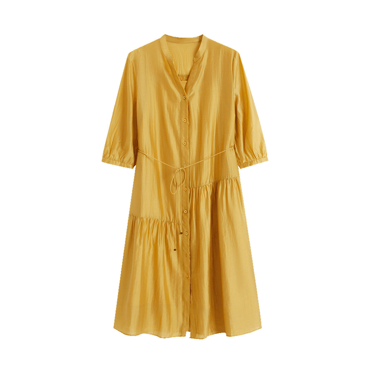 SANI商场同款2026春季爽滑天丝连衣裙气质高级感A字收腰中长裙女