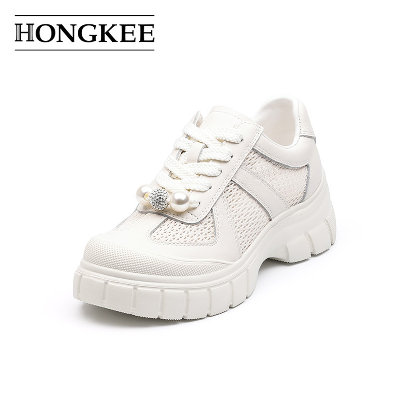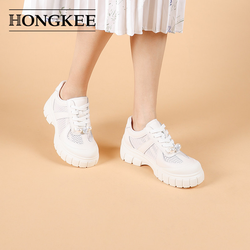 Hongkee/红科女鞋2025新款夏季透气网眼厚底系带休闲板鞋HD95D202
