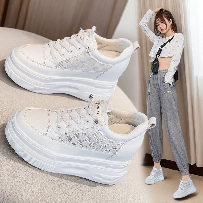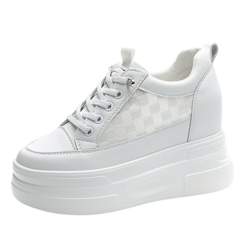 夏天小白鞋女透气内增高女鞋10cm网面真皮白鞋休闲松糕鞋厚底网鞋