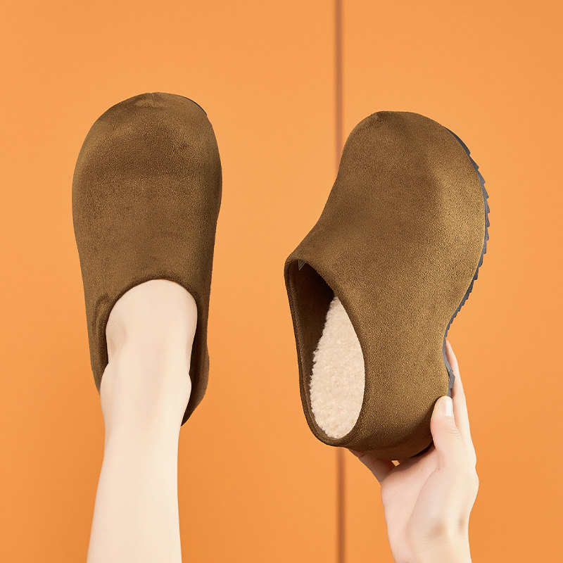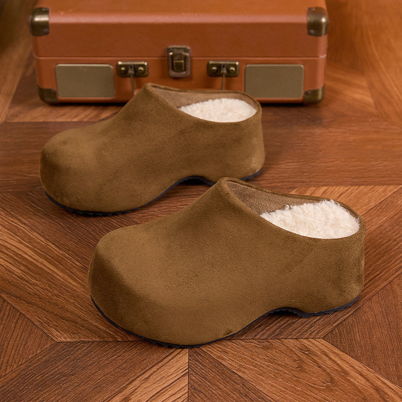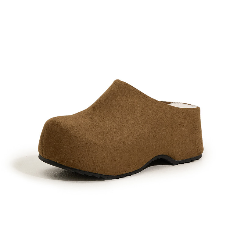 冬季加绒厚底勃肯鞋女包头拖鞋真皮懒人鞋增高6cm棕色半拖鞋轻便