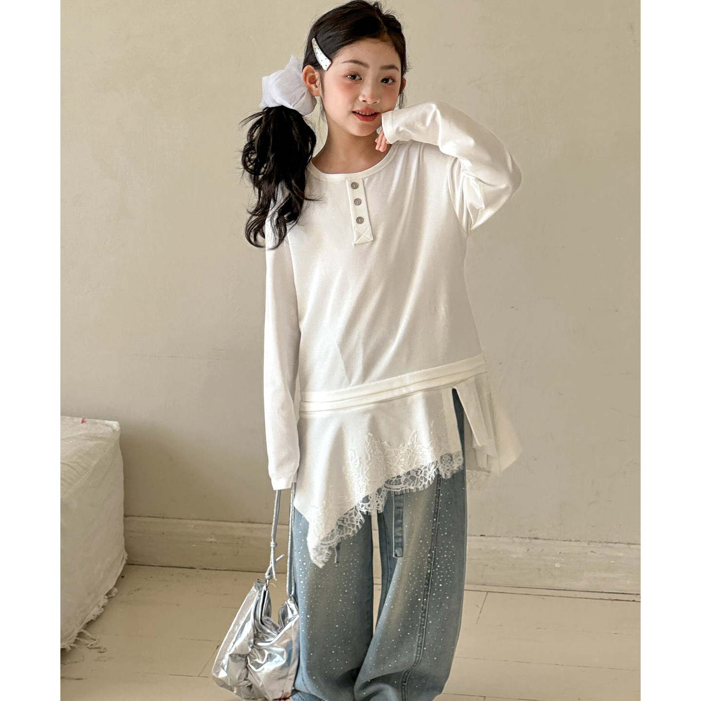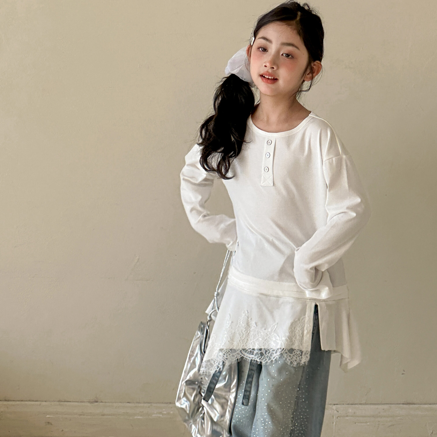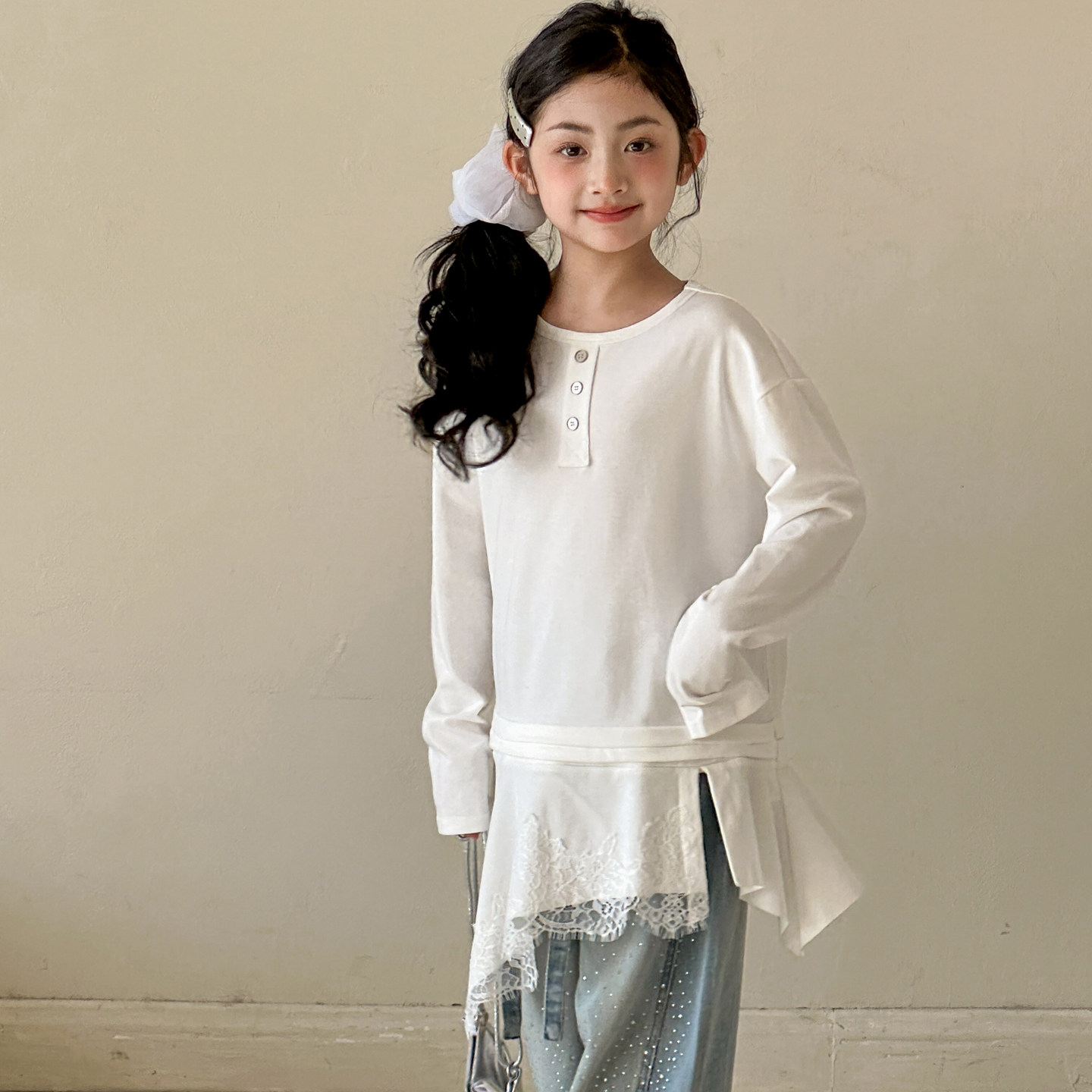 女童长袖T恤2026春装新款女大童内搭上衣儿童假两件拼接不规则T裙