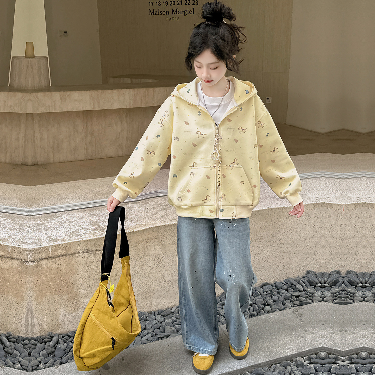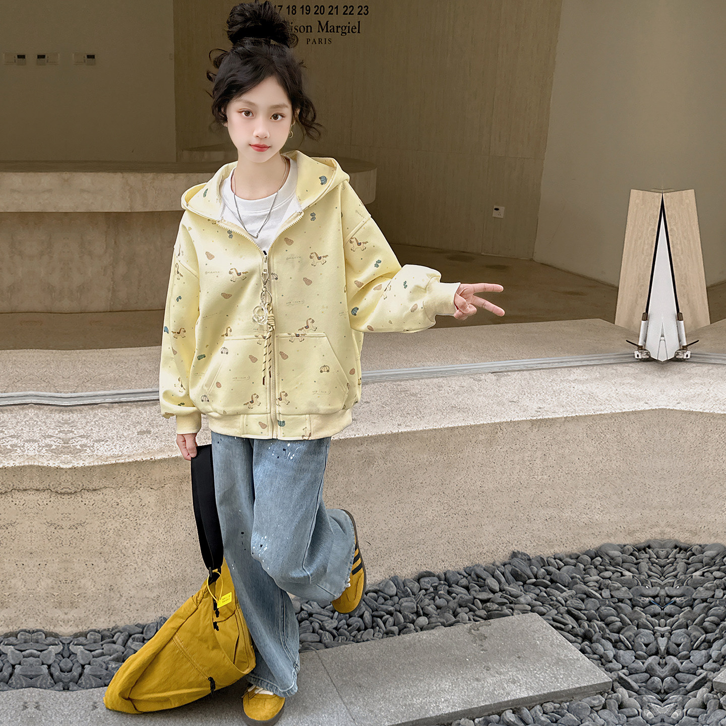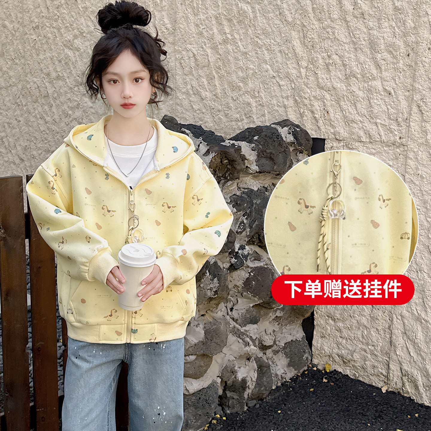 女童连帽开衫外套2026春装新款女孩初中学生大童韩版印花卫衣套装