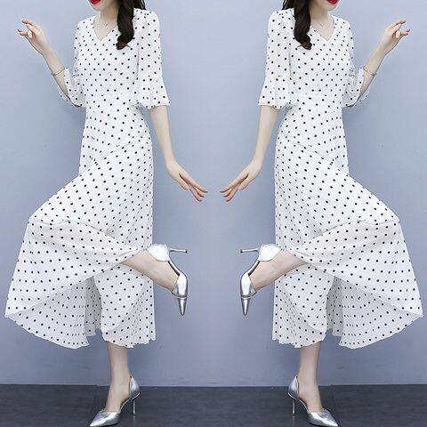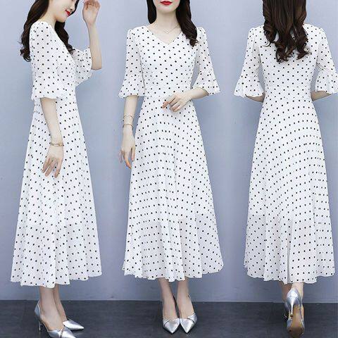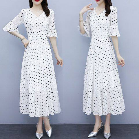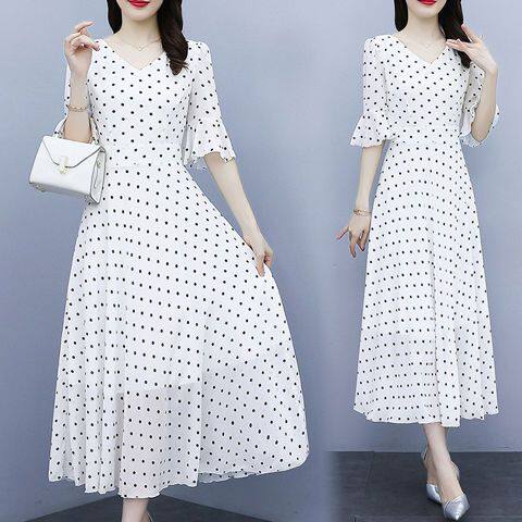 夏季大码女装沙滩裙V领波点连衣裙收腰显瘦白色雪纺长款大摆长裙