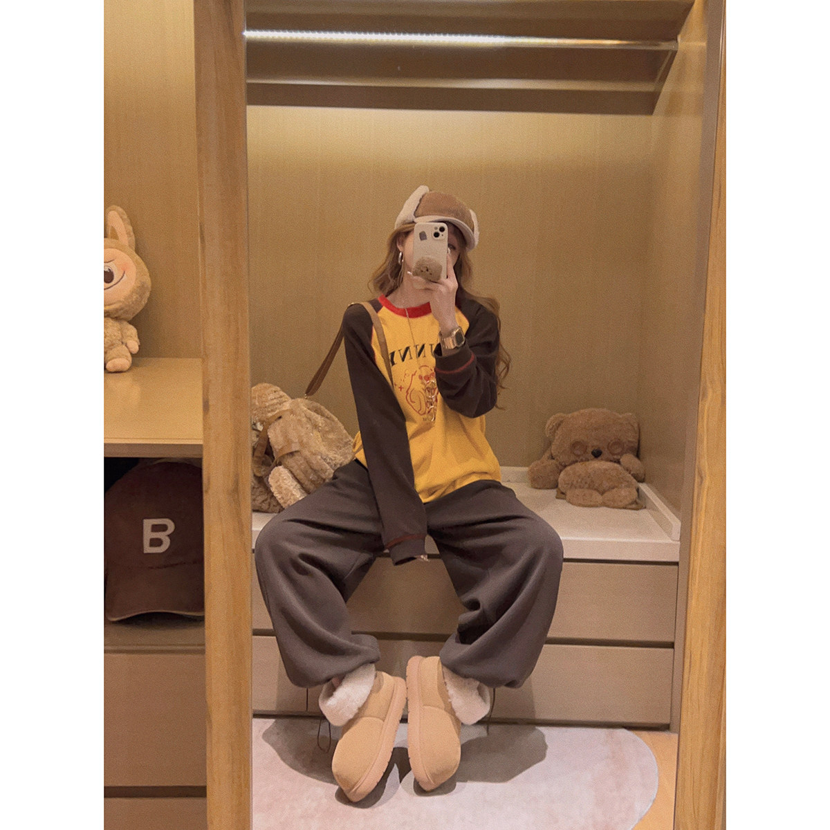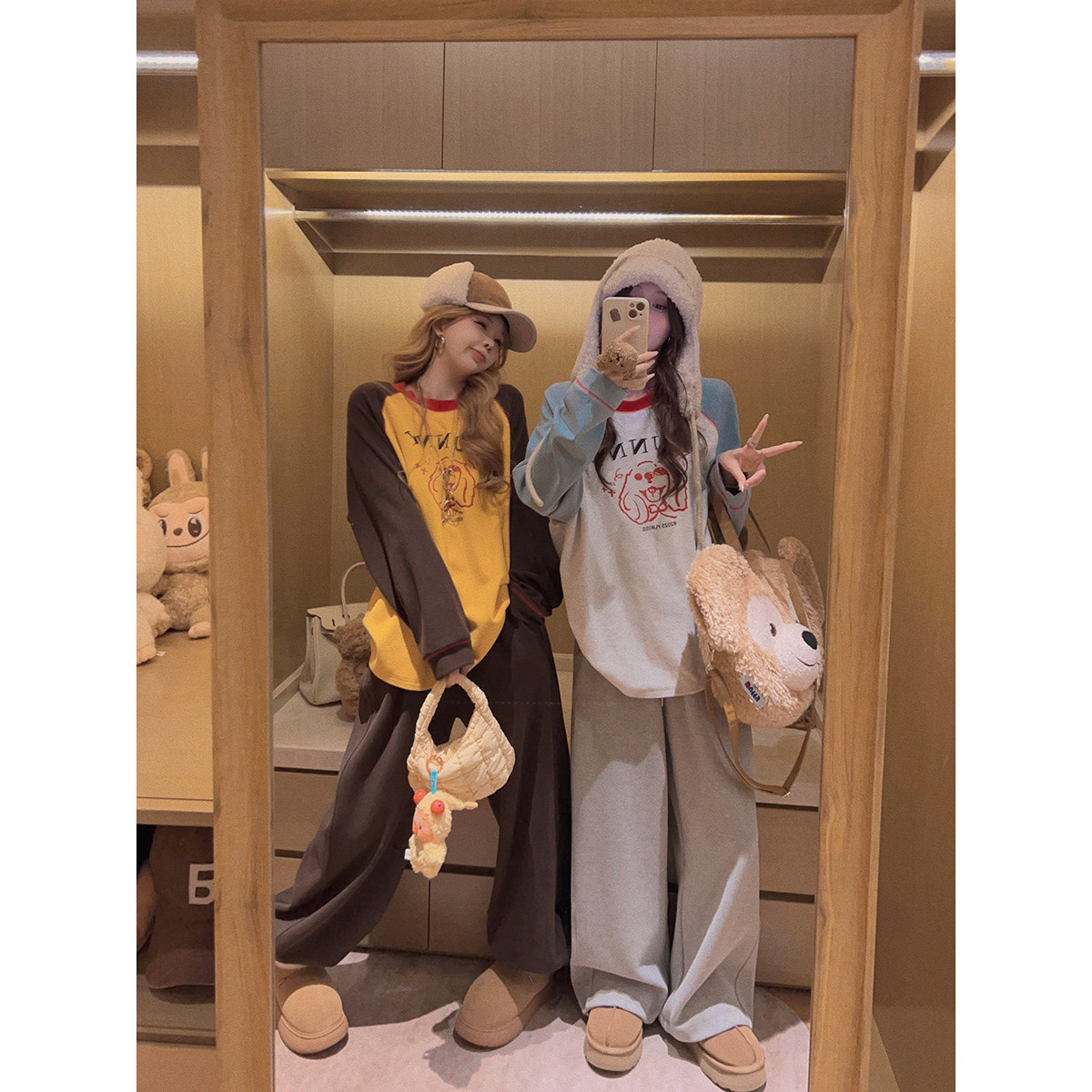 Yukiss 插肩袖撞色加绒长袖T恤女秋冬韩系宽松显瘦圆领休闲打底衫