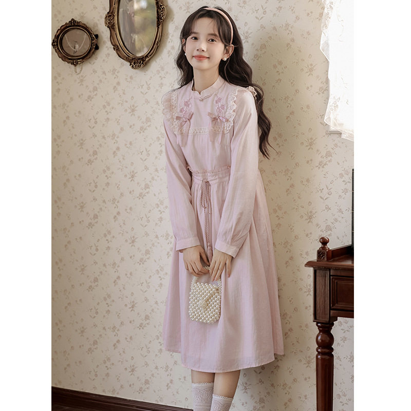 2025秋季新款国风甜美立领刺绣蝴蝶结灯笼长袖收腰显瘦连衣裙女