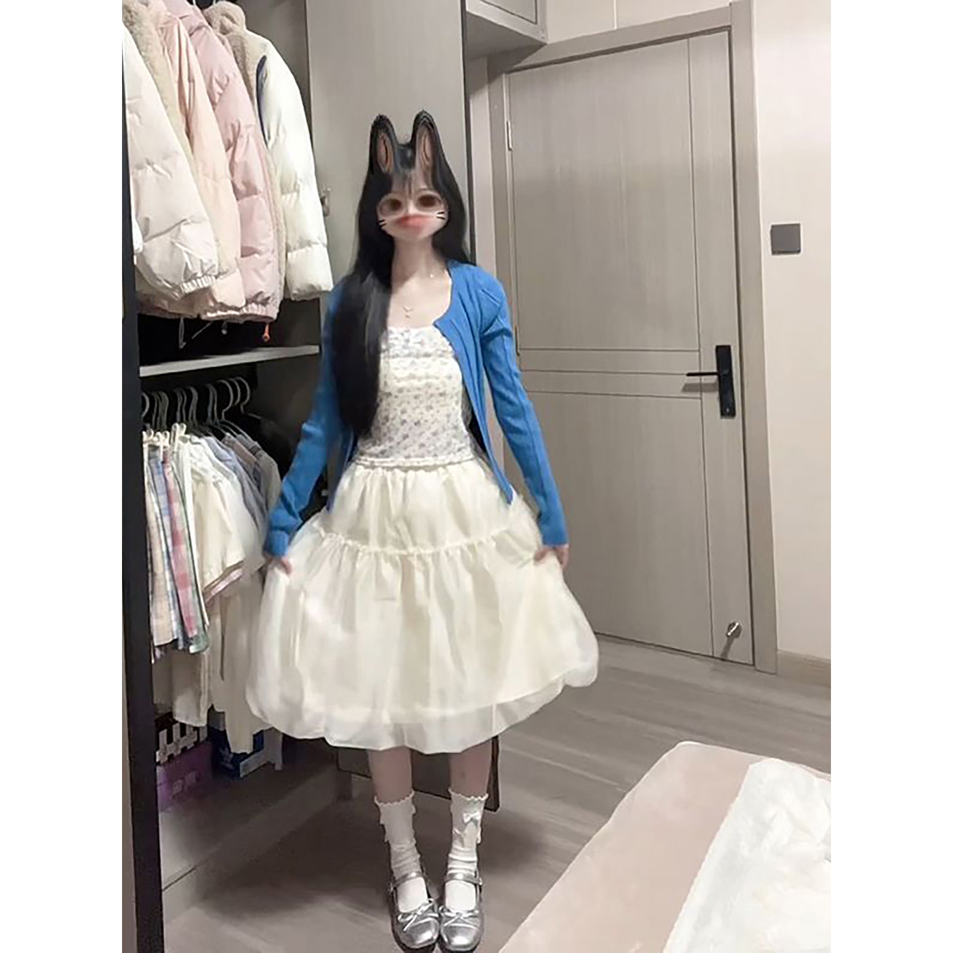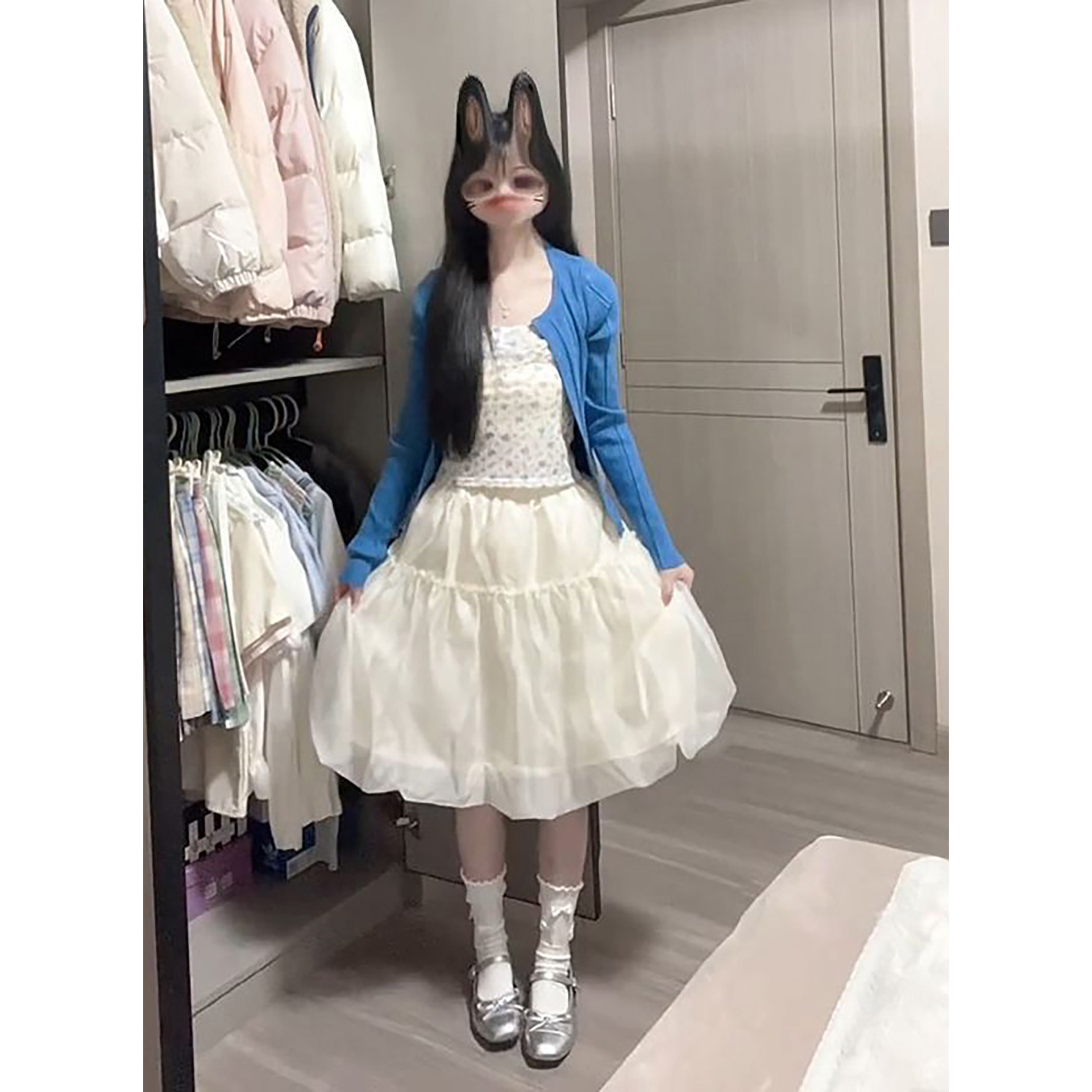 新款温柔气质学院风蓝色针织开衫+碎花吊带+花苞半身短裙三件套装