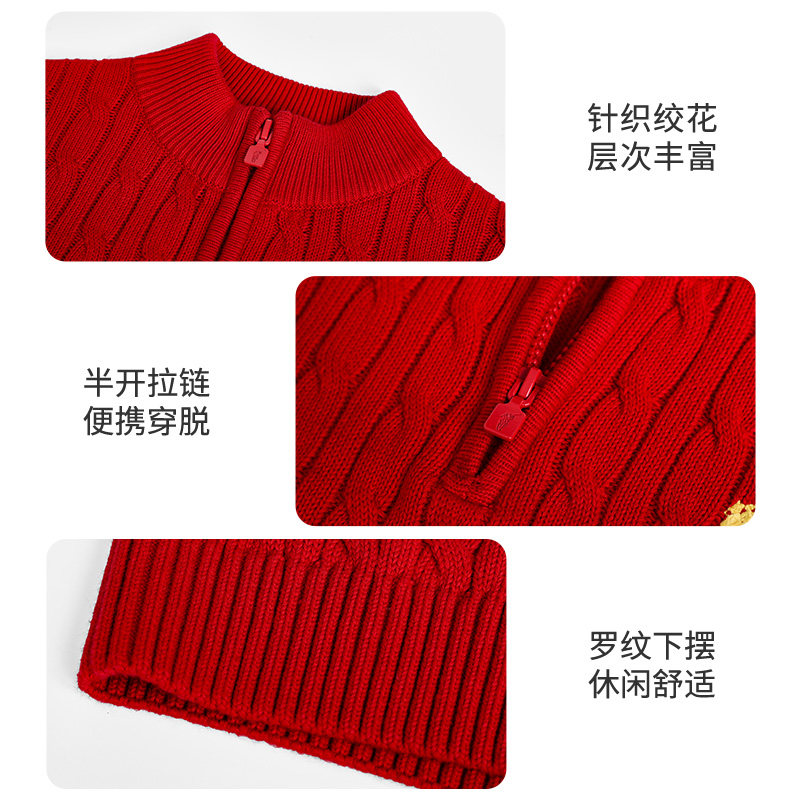 POLOWALK童装男童针织衫2026早春新款绞花立领中大童红色纯棉毛衣