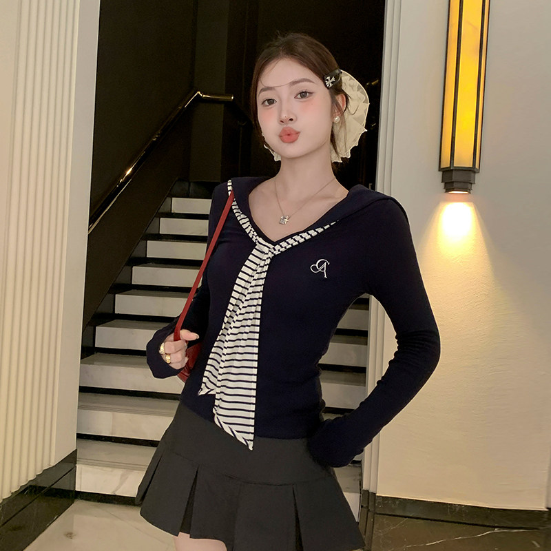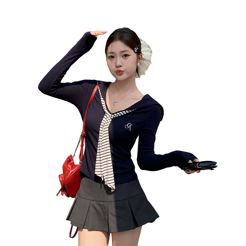 龙妹家藏青色V领长袖T恤女外穿内搭2026早春新款绝美修身打底上衣