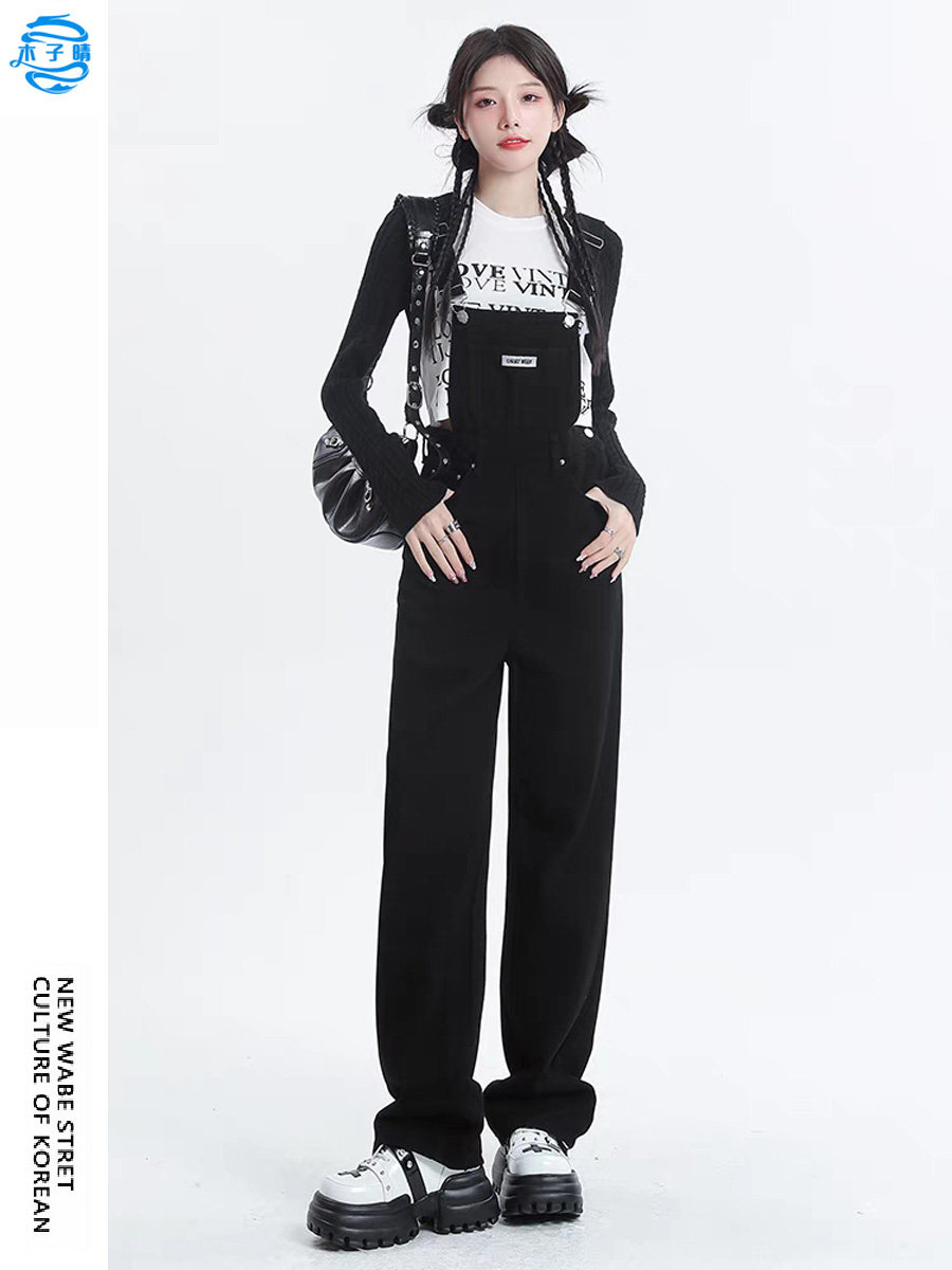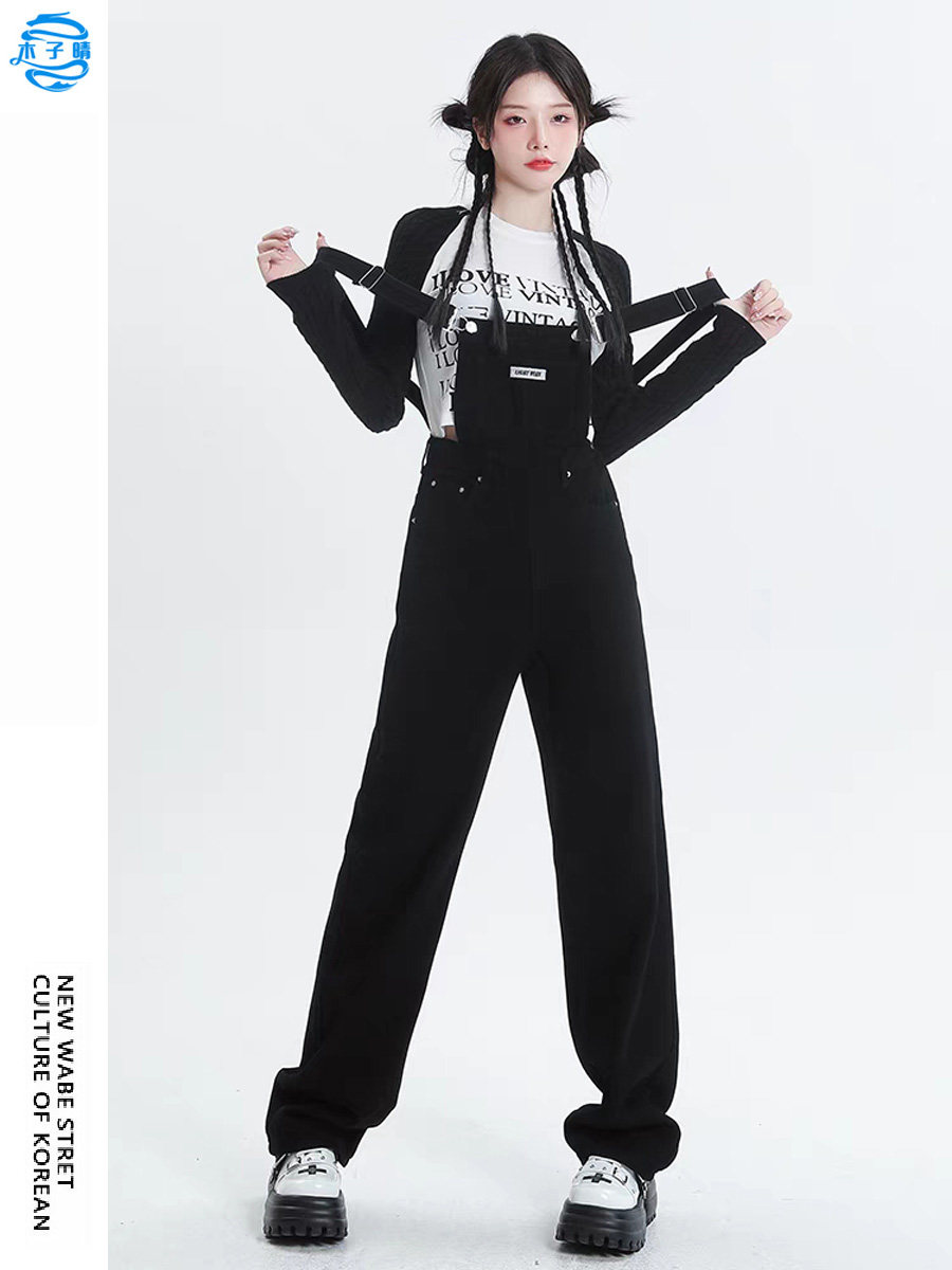 黑色宽松显瘦牛仔背带裤女2026新款春季减龄小个子直筒阔腿长裤子
