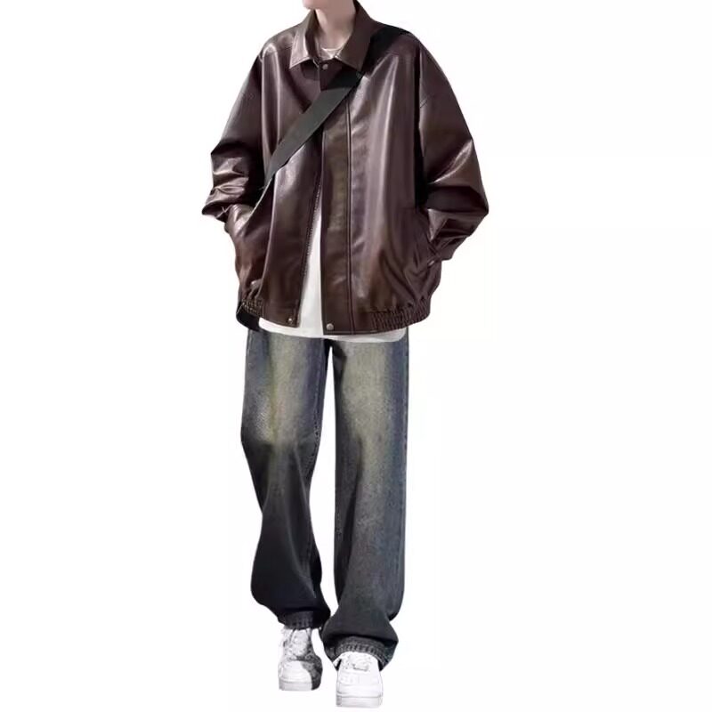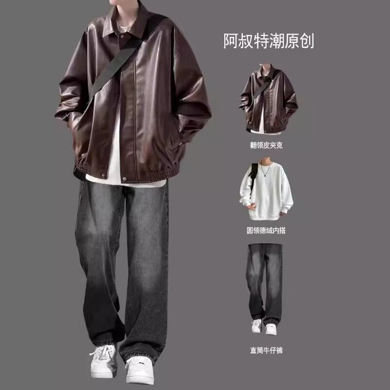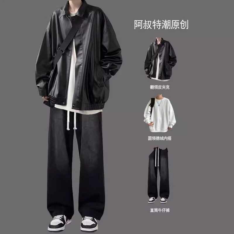 痞帅复古机车美式风皮衣夹克男款套装春秋季潮牌高级感外套三件套