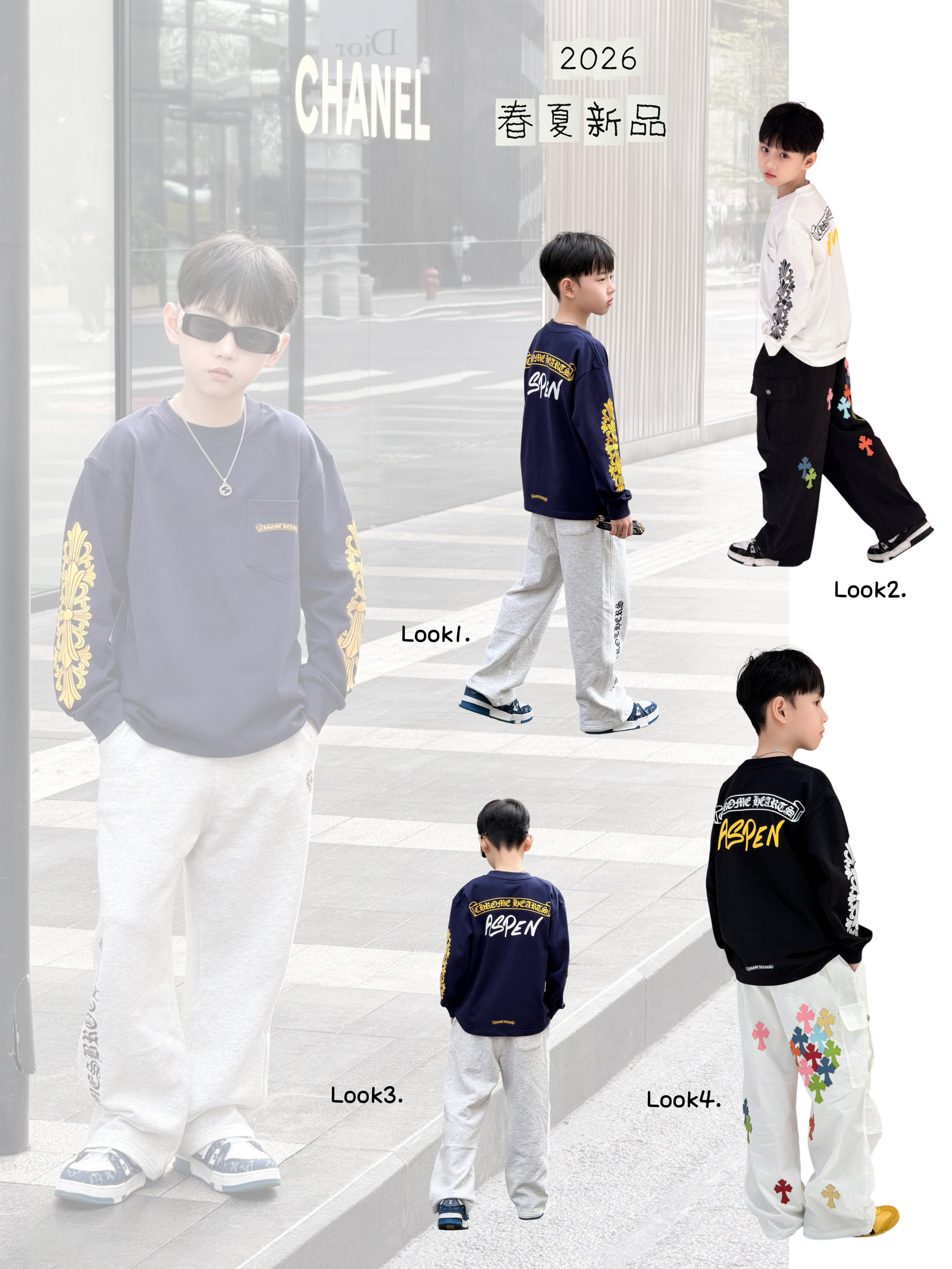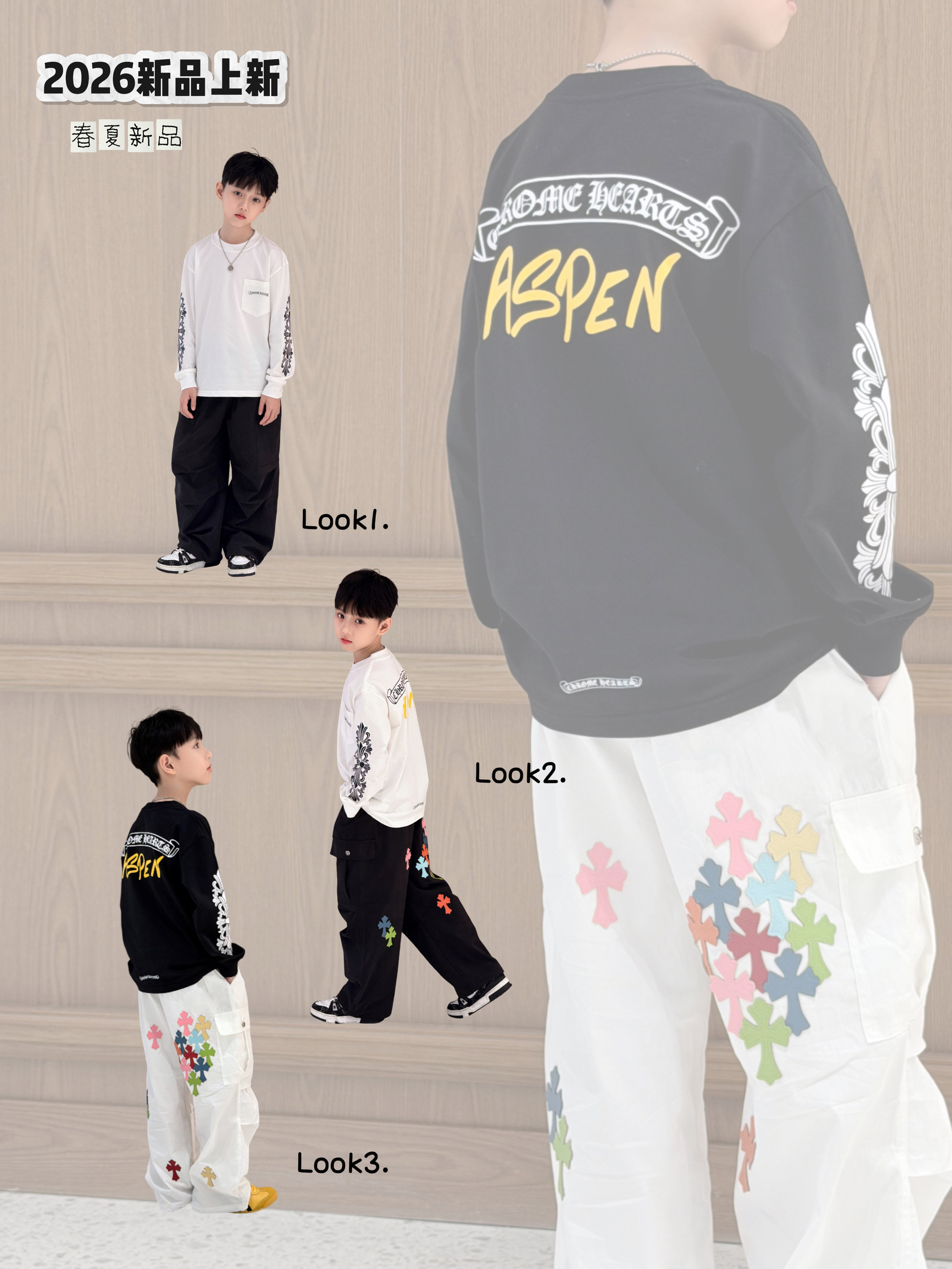 26春季新款潮牌童装梵文纯棉长袖T恤彩色十字工装裤男童帅气套装