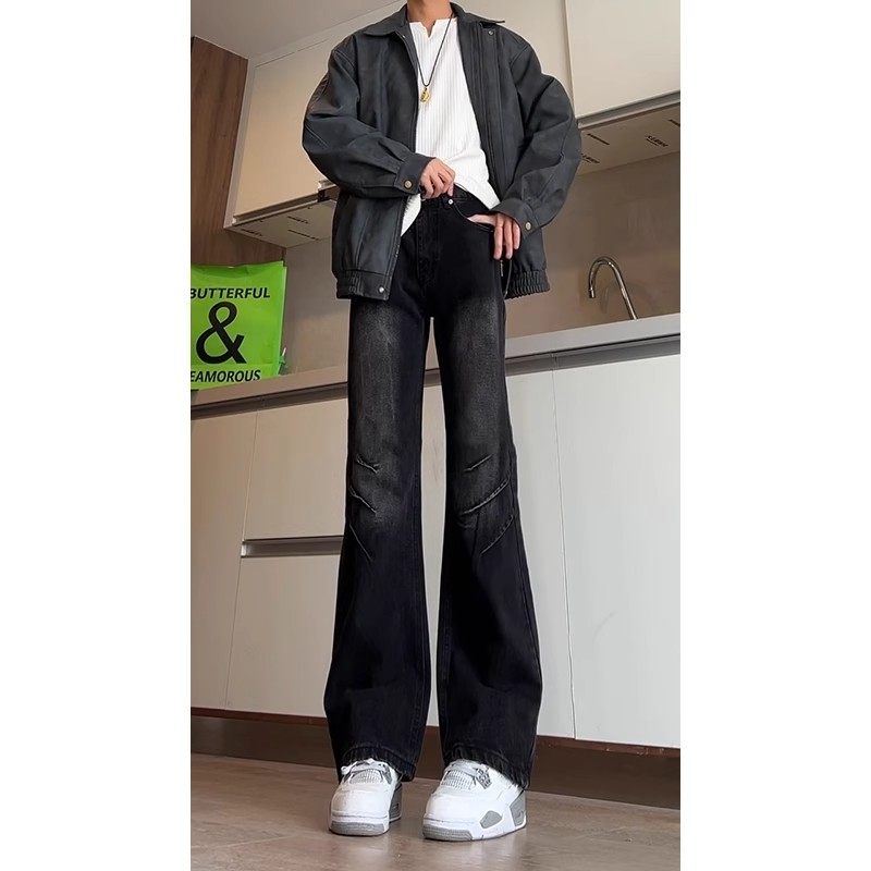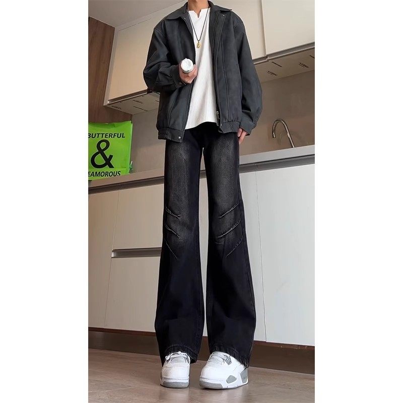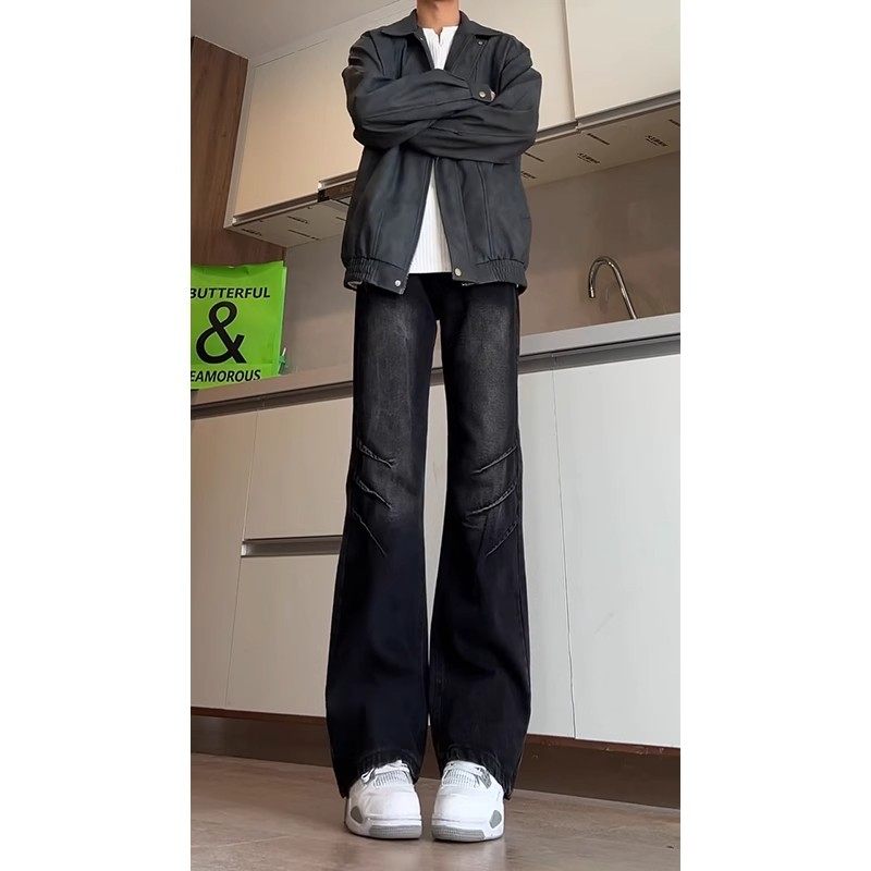 黑色褶皱弯刀牛仔裤男款美式高街vibe裤子水洗复古修身直筒微喇裤