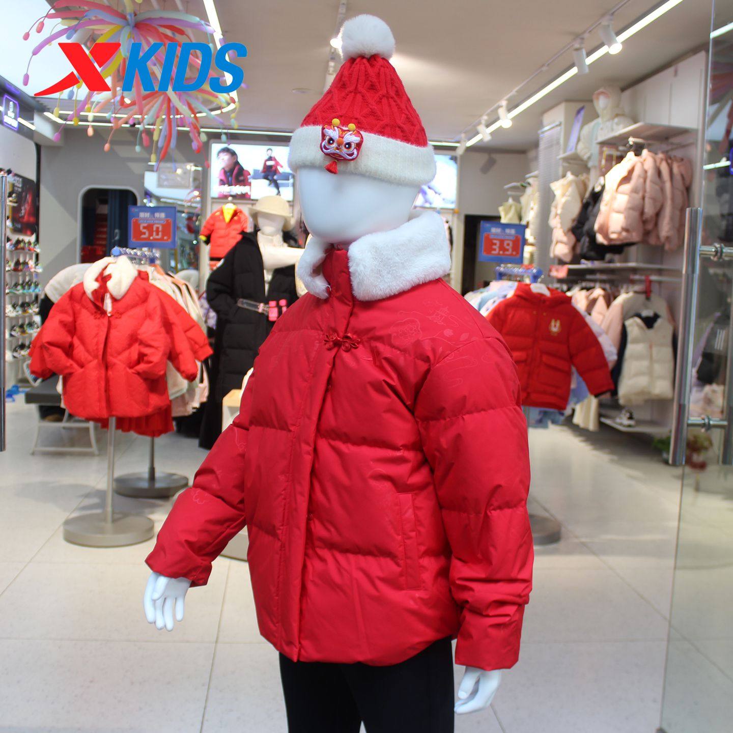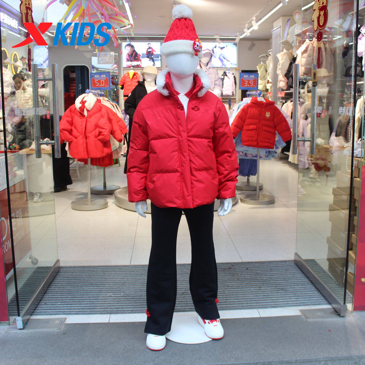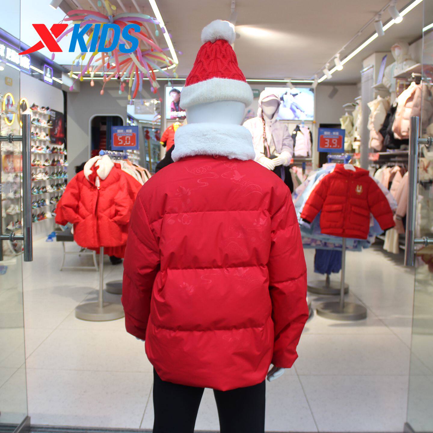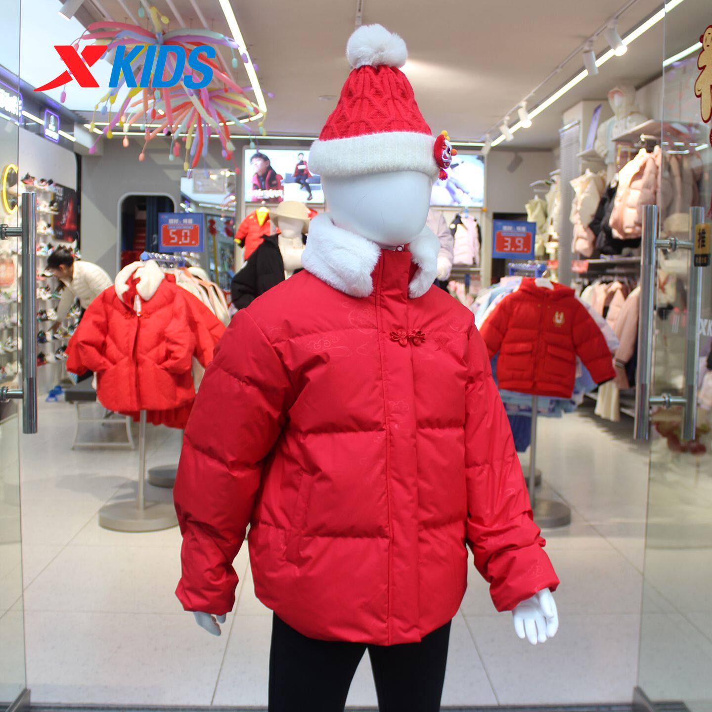 特步儿童2026春女童红色毛领羽绒服复古新年装中国红674124194041