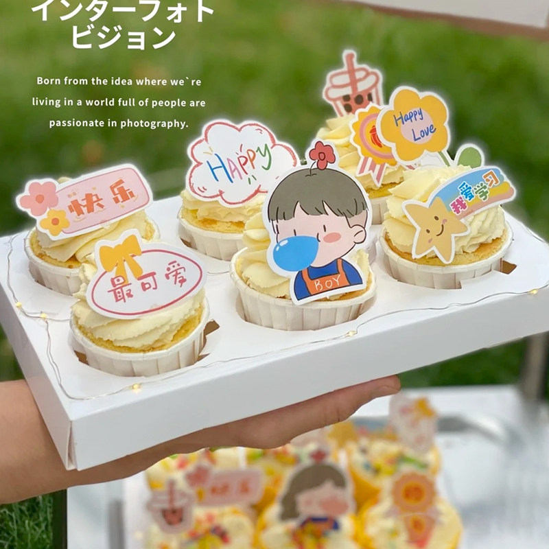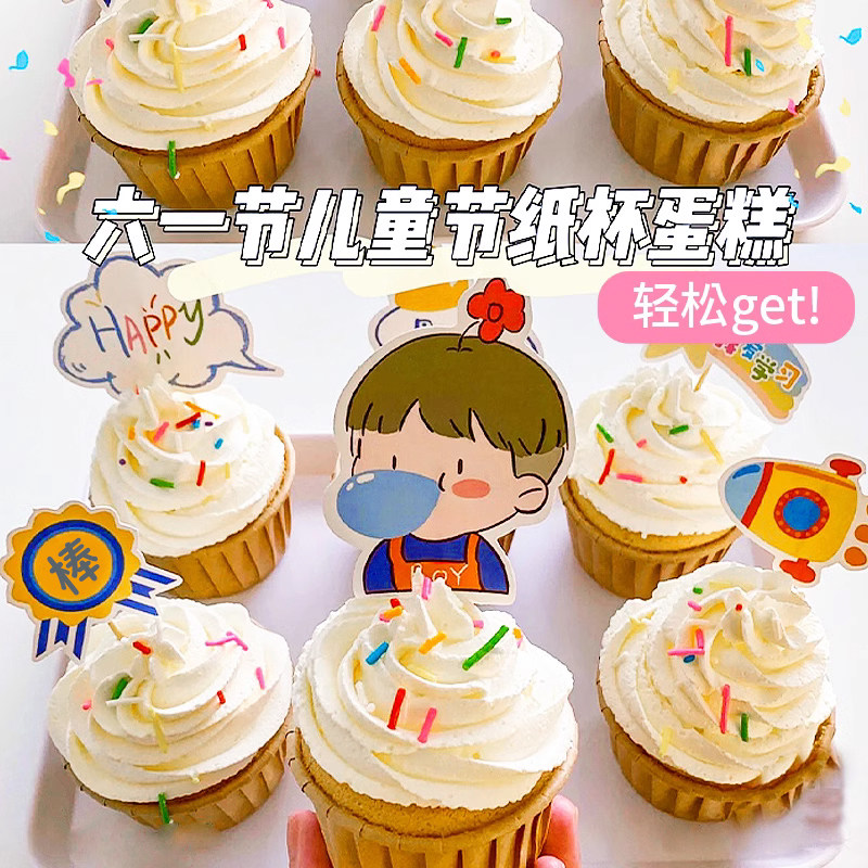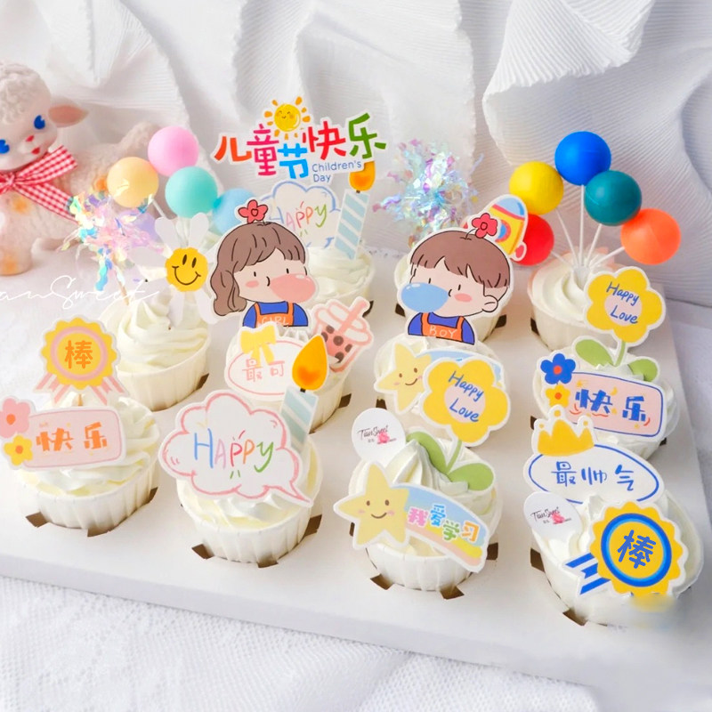 卡通儿童节蛋糕装饰插件纸杯甜品插卡吹泡泡男孩女孩节日快乐插旗