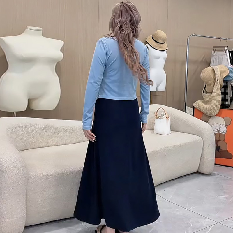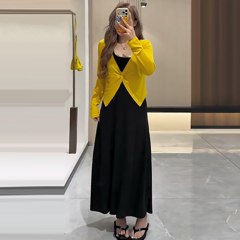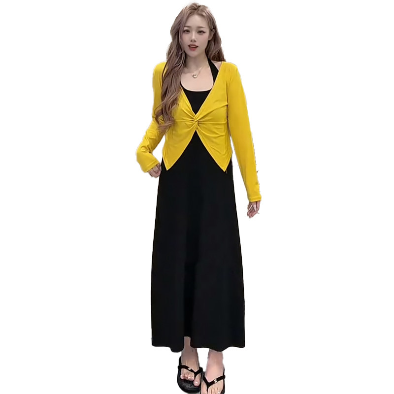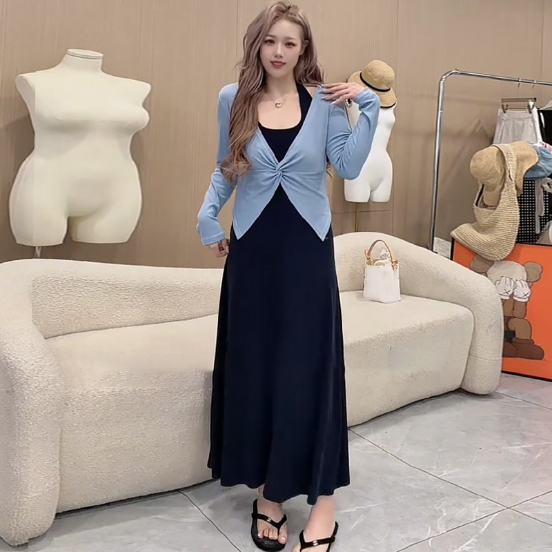 纽结长袖上衣挂脖连衣裙子套装胖mm2026春季新款显瘦宽松大码女装