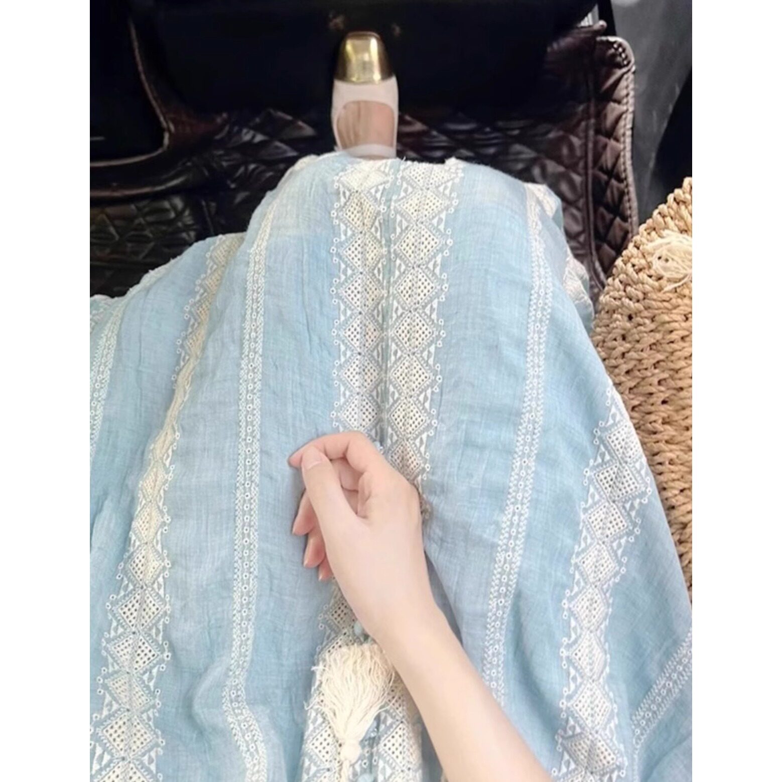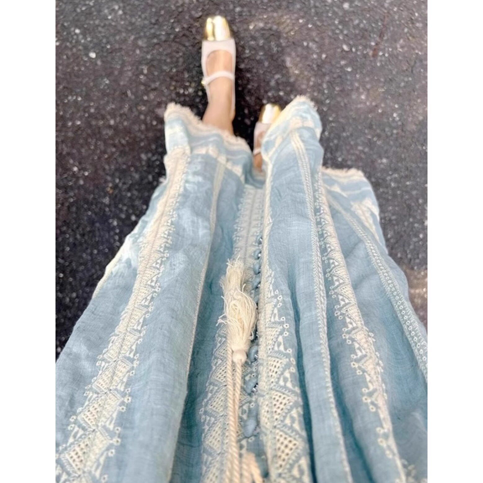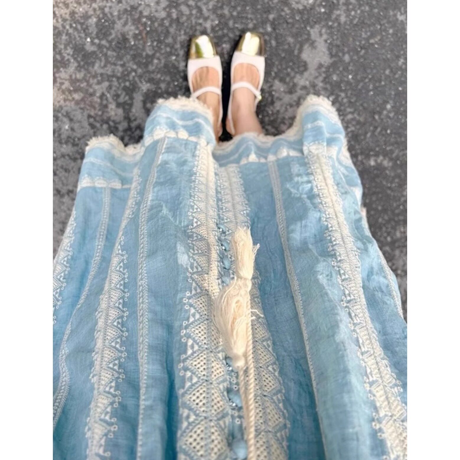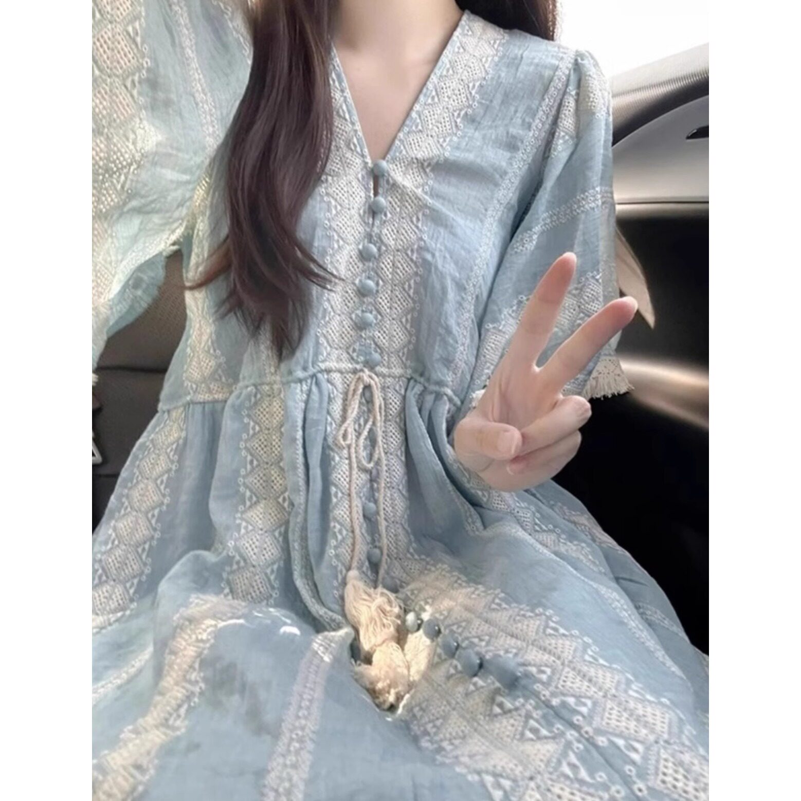 夏季法式波西米亚刺绣连衣裙女大码胖mm蓝色海边度假民族风长裙子