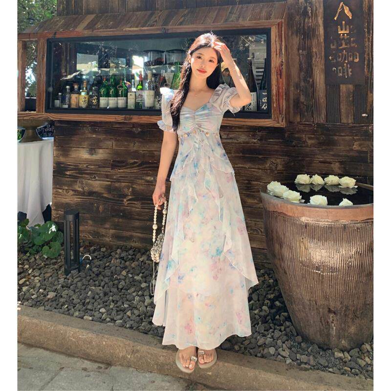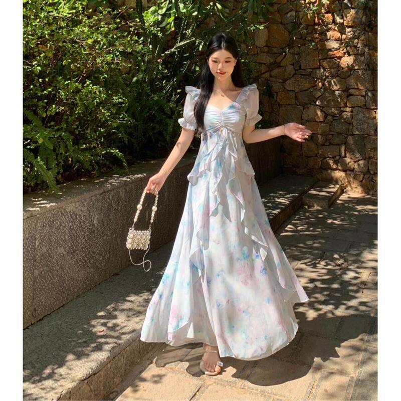 大码胖MM2025夏季飘逸雪纺渐变印花连衣裙海边度假风荷叶边裙子女