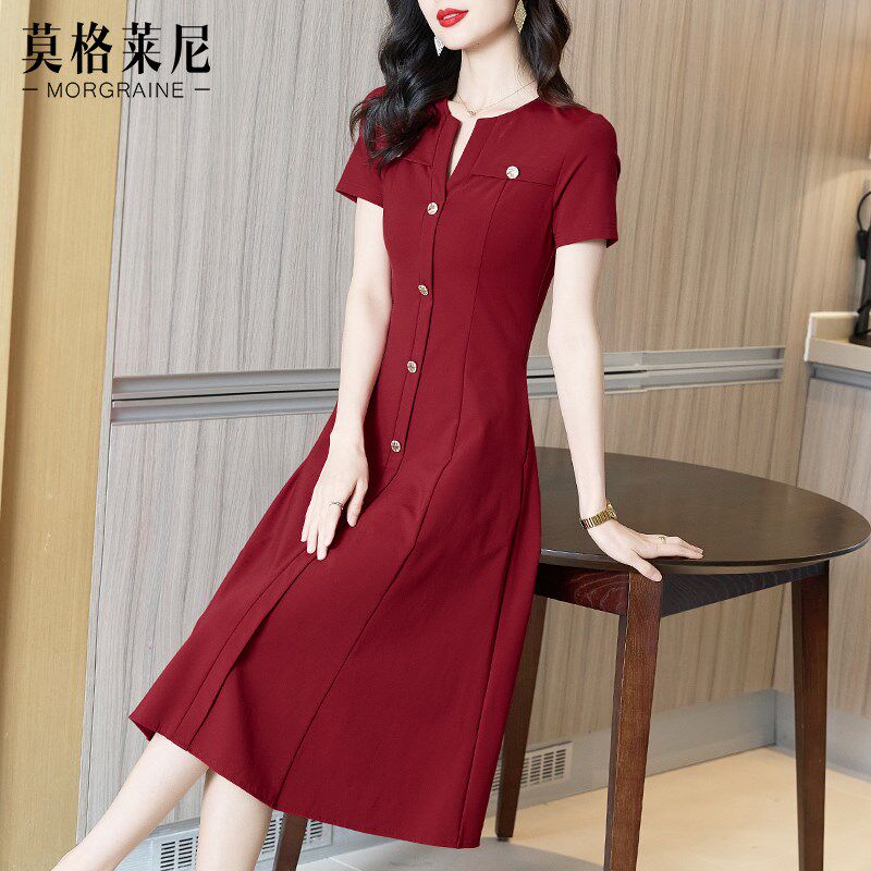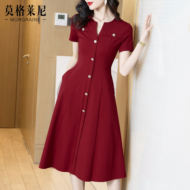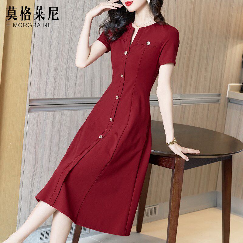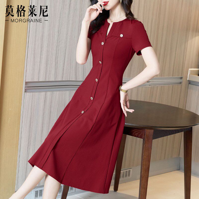 红色修身连衣裙收腰显瘦气质名媛轻奢高级感2024年新款女夏季短袖