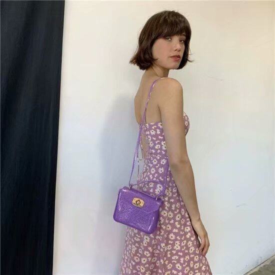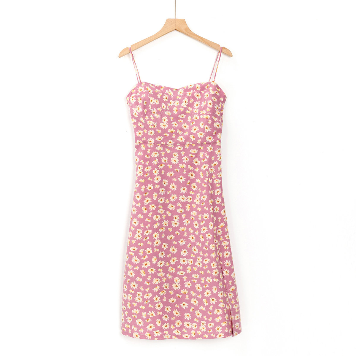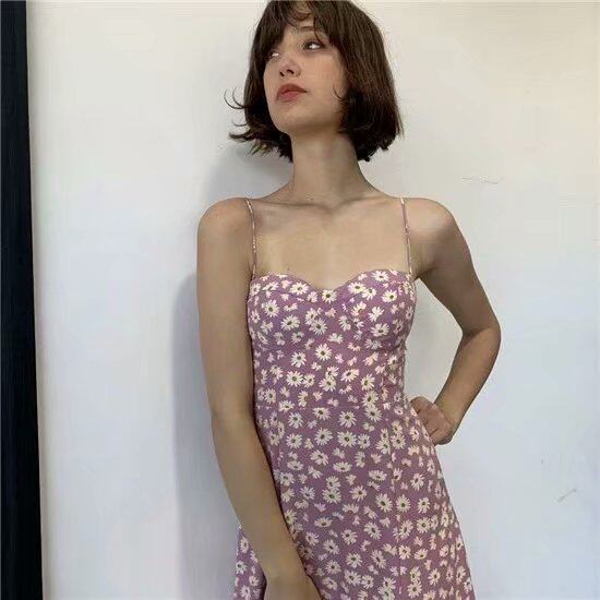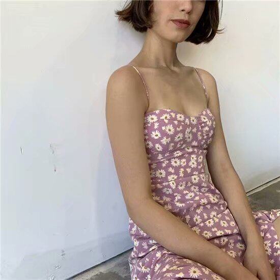 夏日清新小雏菊碎花吊带连衣裙2020新款高腰修身过膝开叉长款裙子