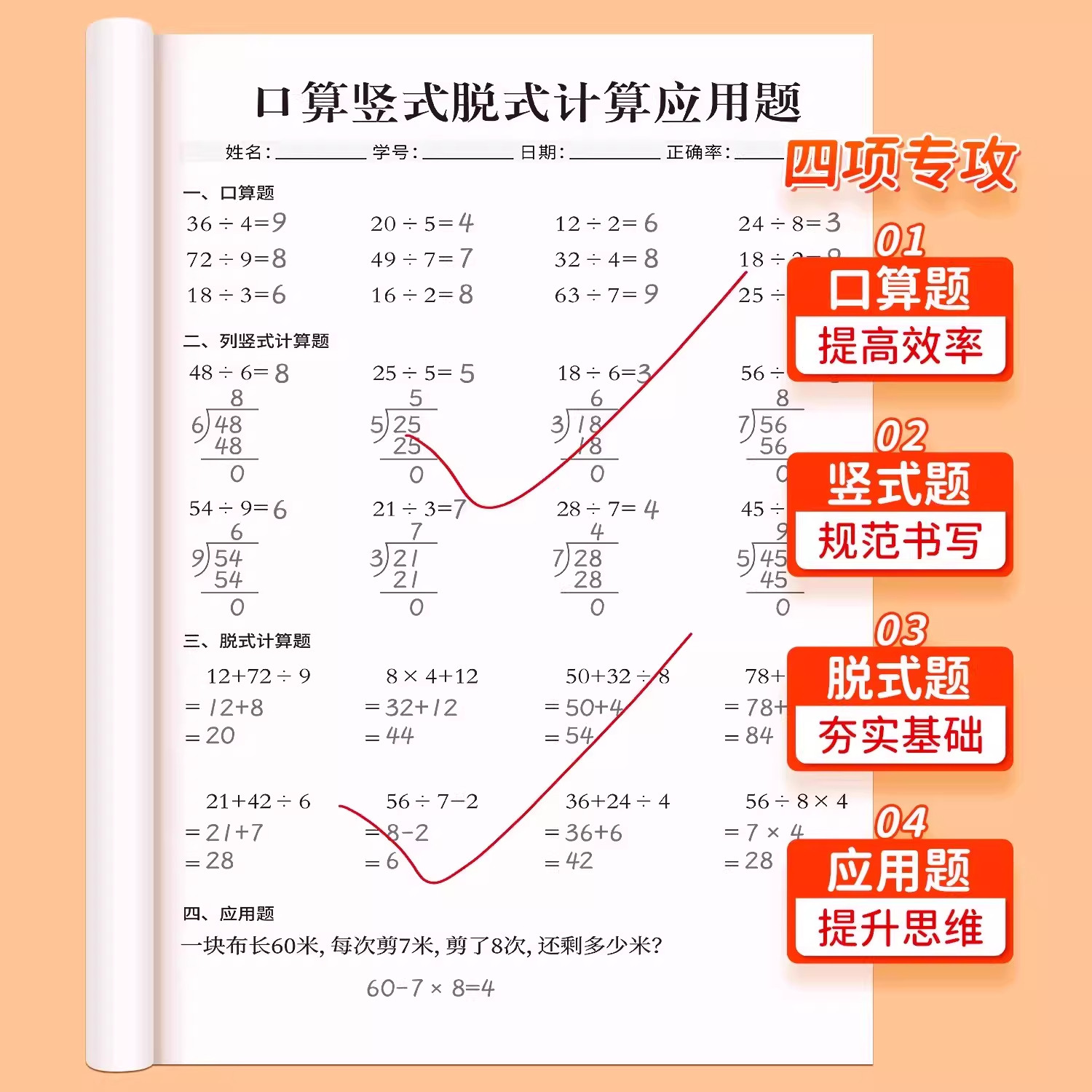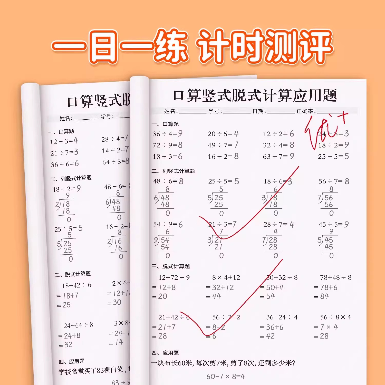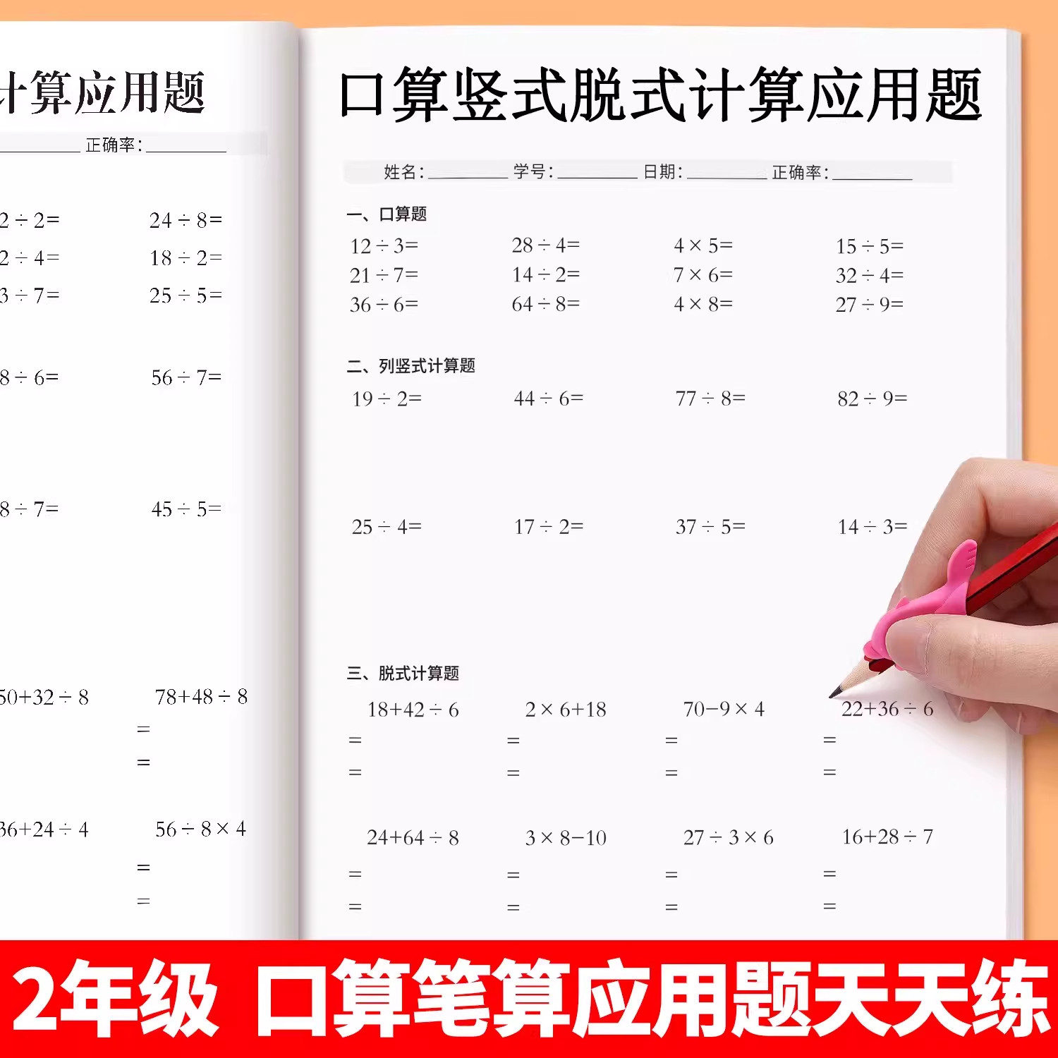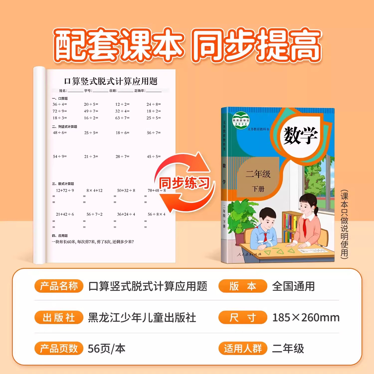 二年级上册下册数学口算天天练人教版口算题卡竖式脱式计算应用题专项强化训练每日一练小学加减乘除法速算题思维训练同步练习册