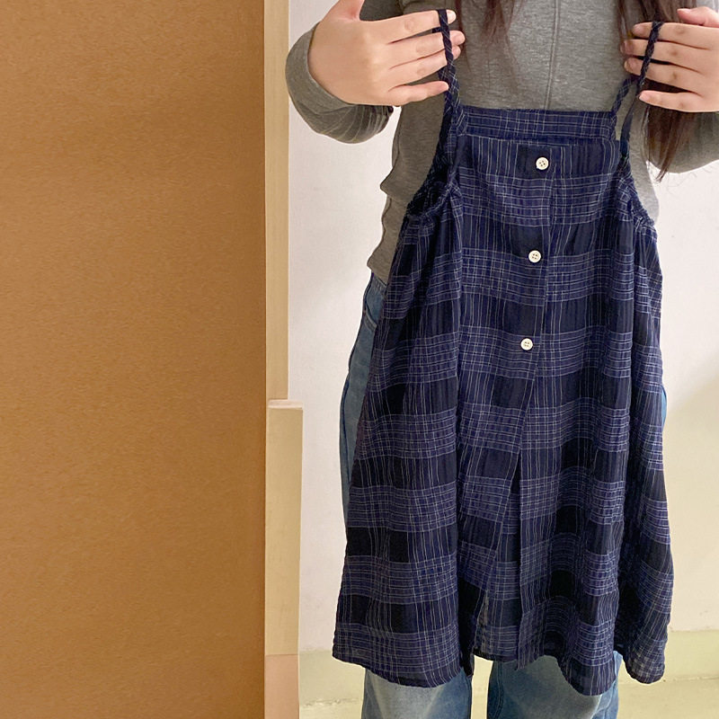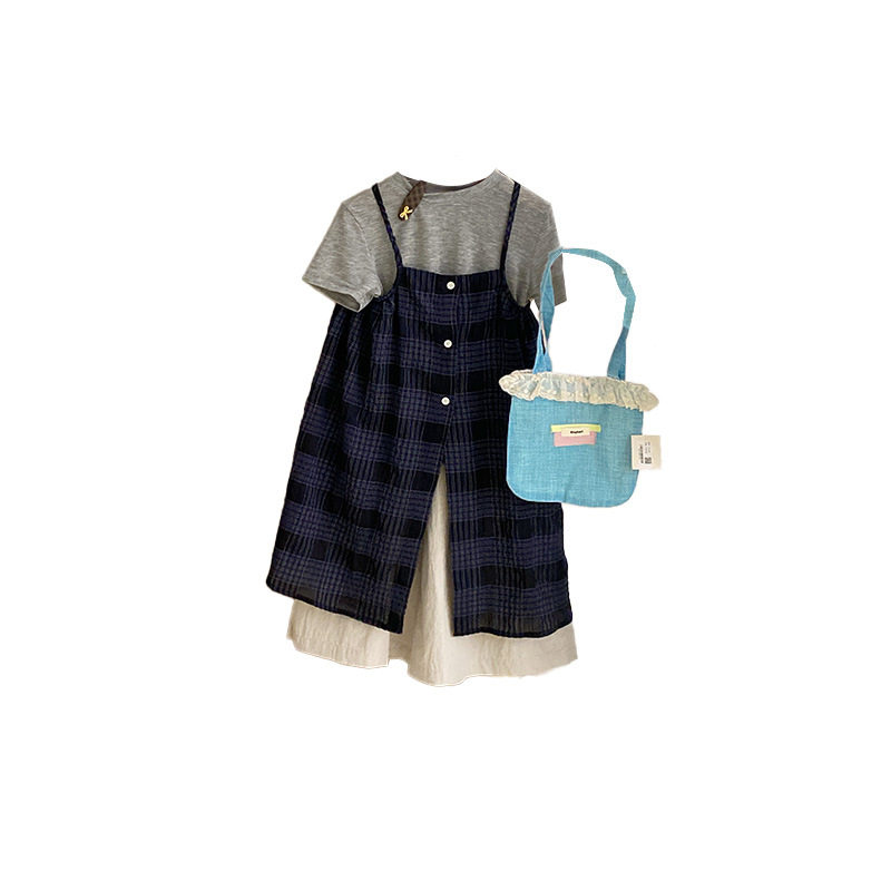 女童时髦短袖T恤格子吊带连衣裙三件套春夏季长裤套装