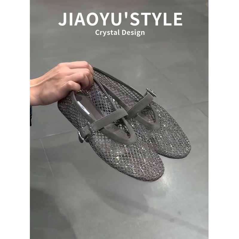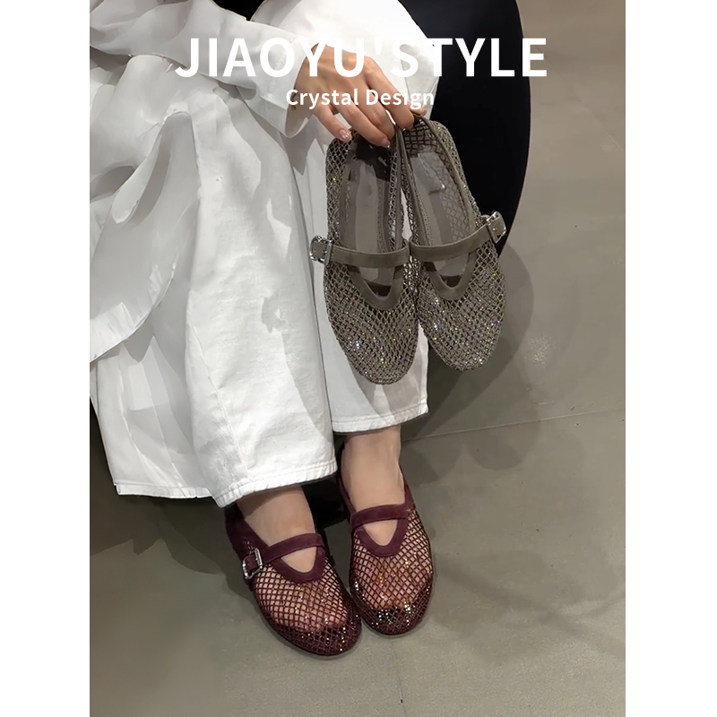 真皮~骄屿镂空水钻包头凉鞋女2026新款渔网鞋透气编织玛丽珍单鞋