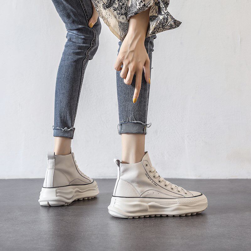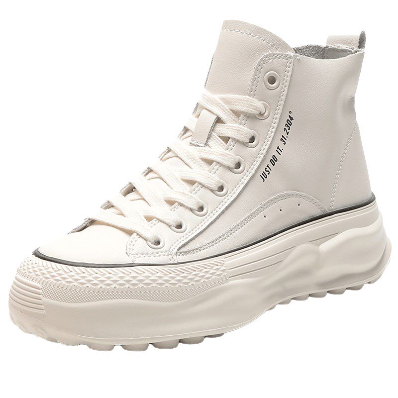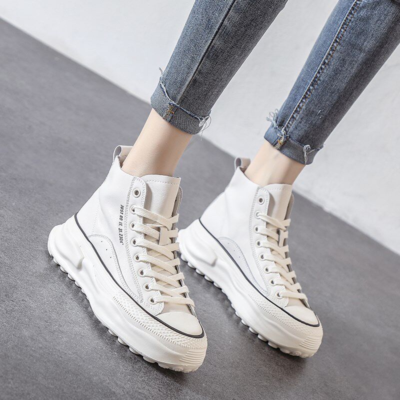 头层牛皮厚底高帮小白鞋女2024春季新款真皮透气增高时尚休闲板鞋