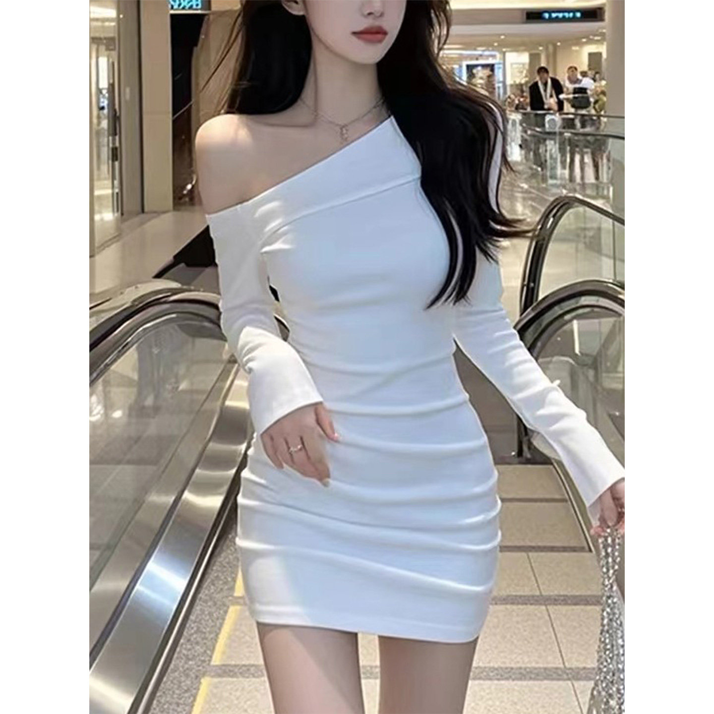 纯欲风白色短裙设计感气质斜肩长袖秋冬连衣裙女性感修身包臀裙