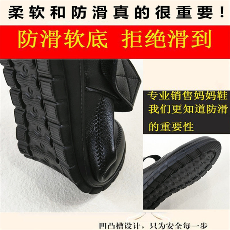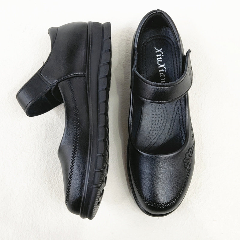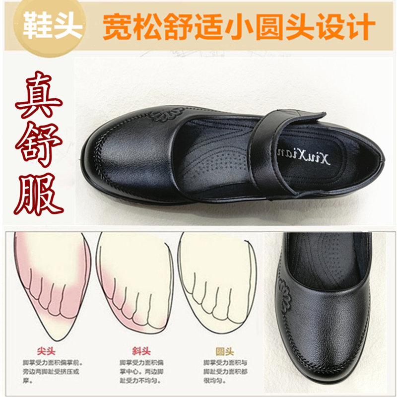 平底软底工作鞋黑色浅口单鞋魔术贴妈妈鞋子低跟中老年女鞋软皮鞋