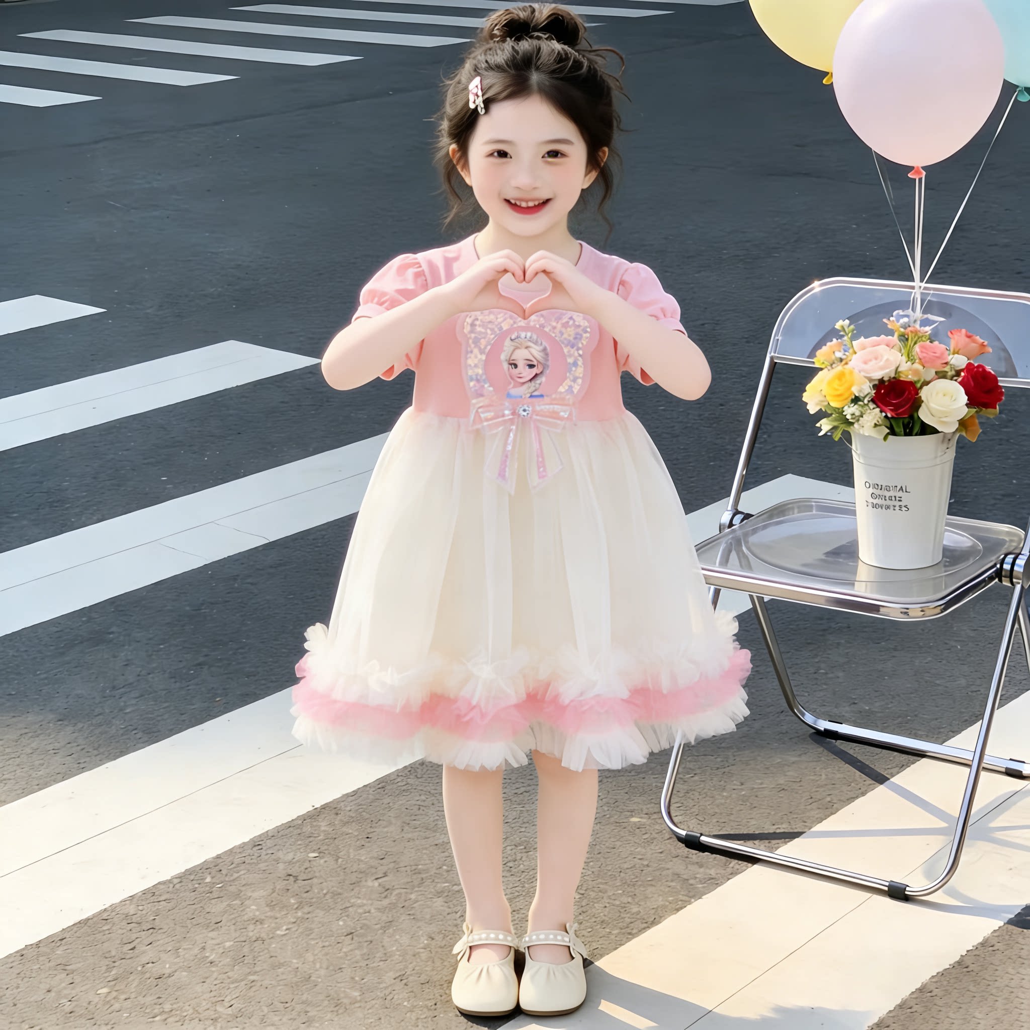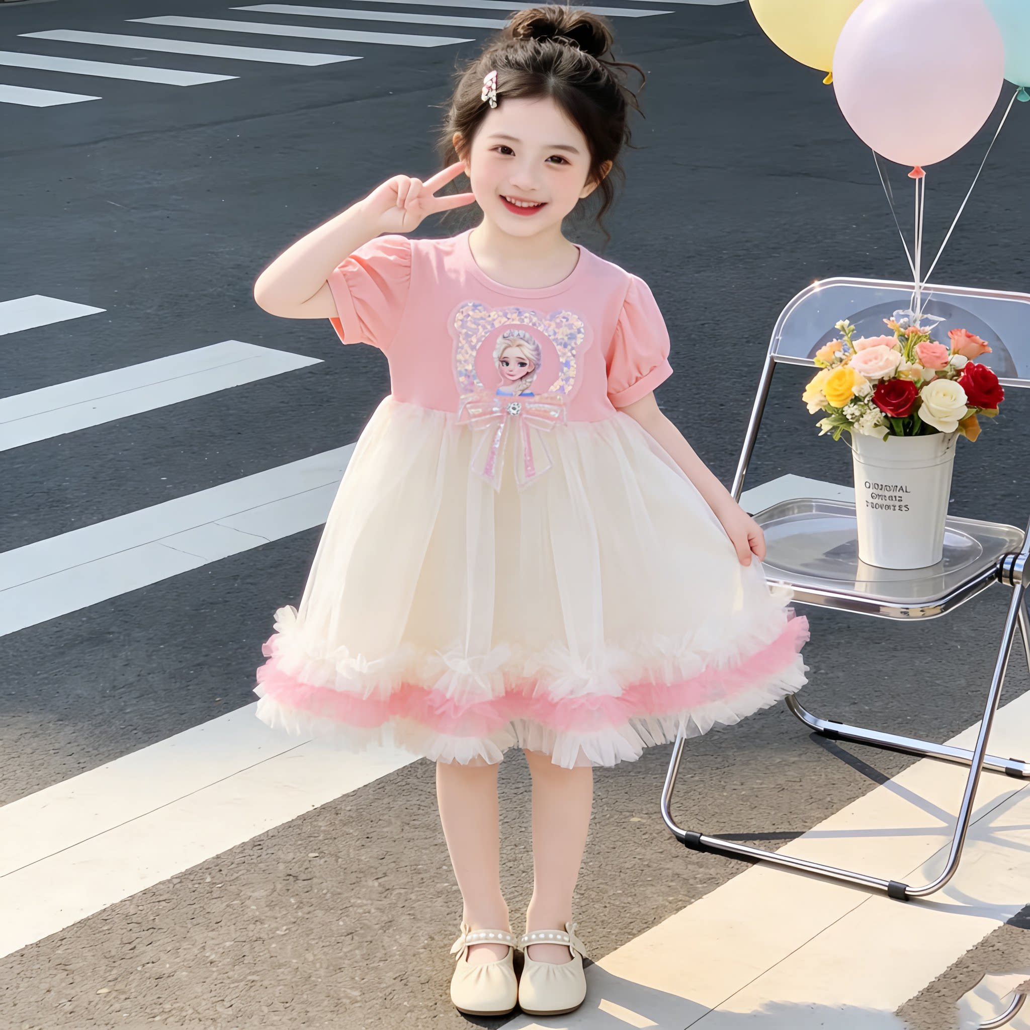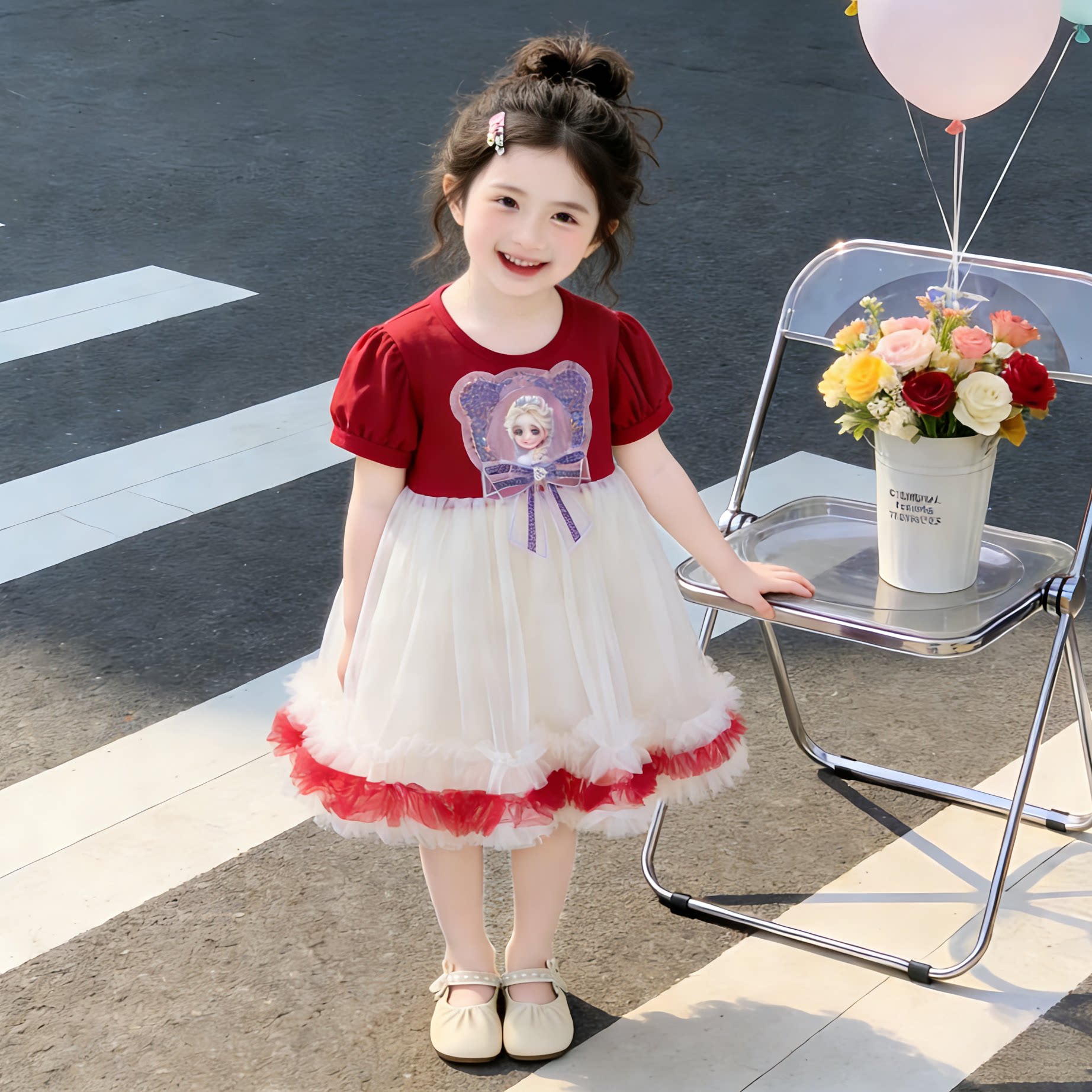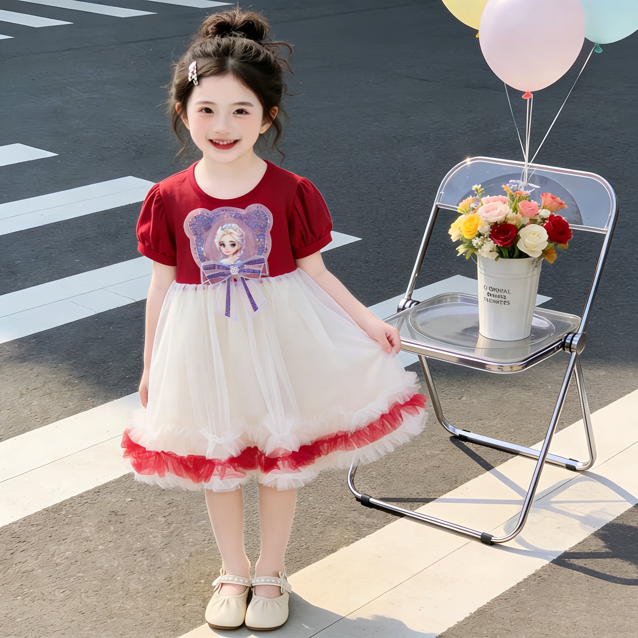 女童艾莎公主裙儿童夏季短袖连衣裙小女孩洋气甜美红色蓬蓬纱裙子