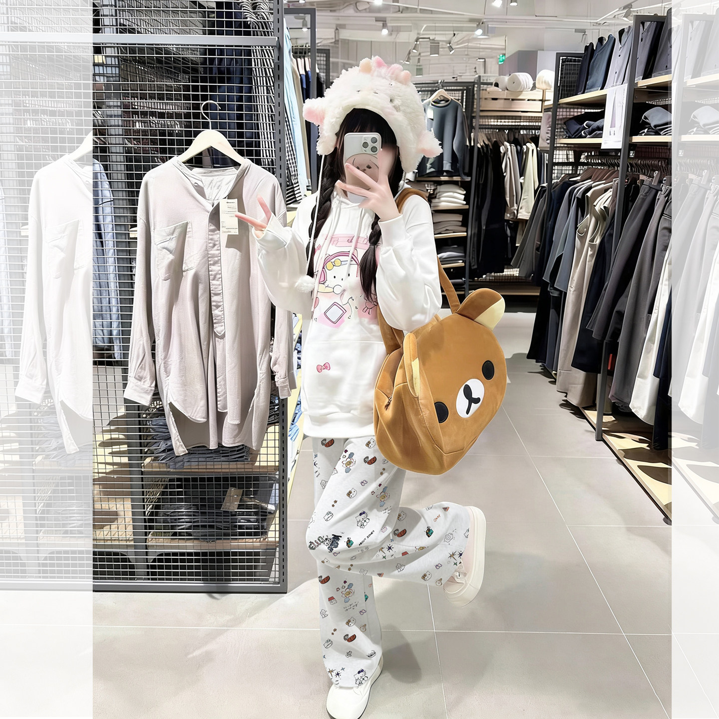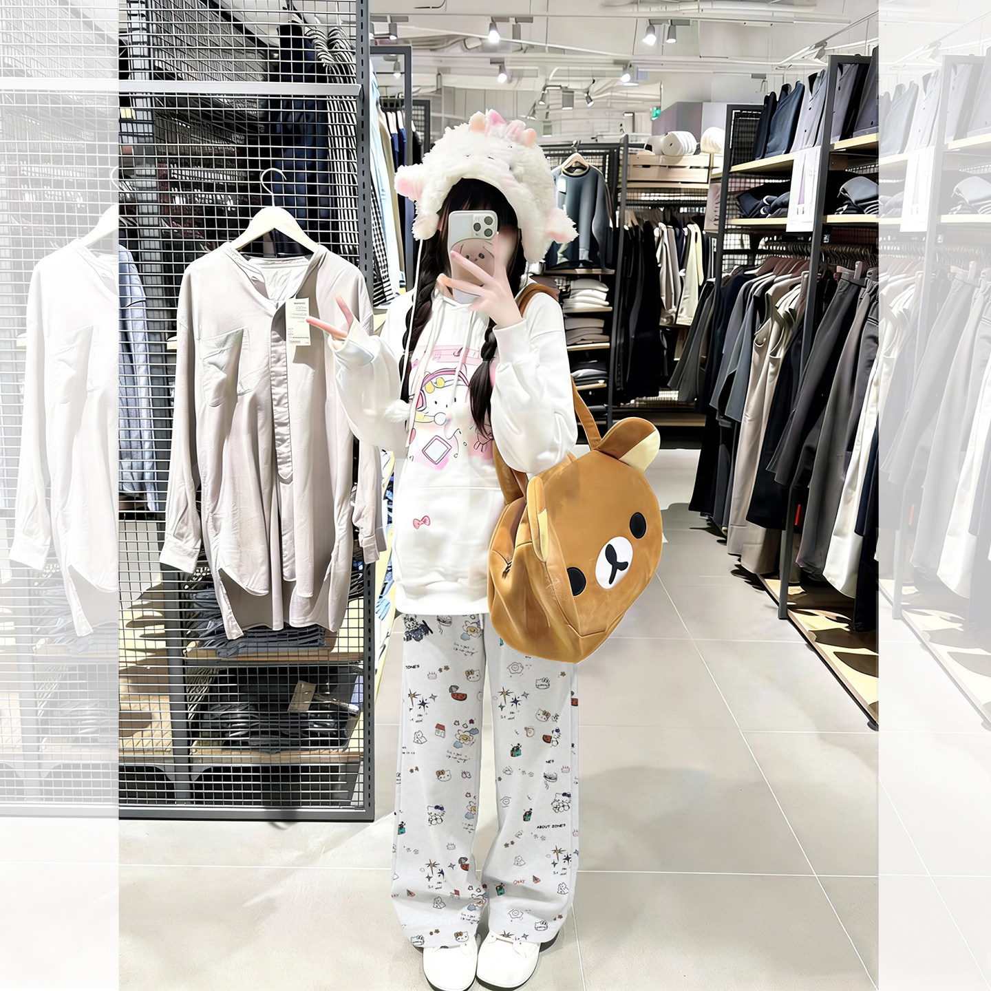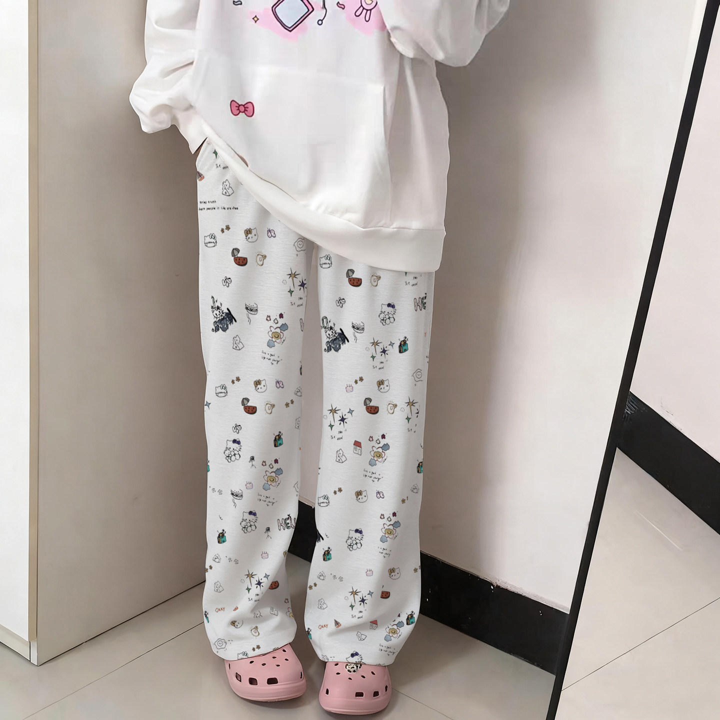 宅系卡通印花直筒休闲裤灰白色卫裤青少年加绒裤子女生阔腿裤冬秋